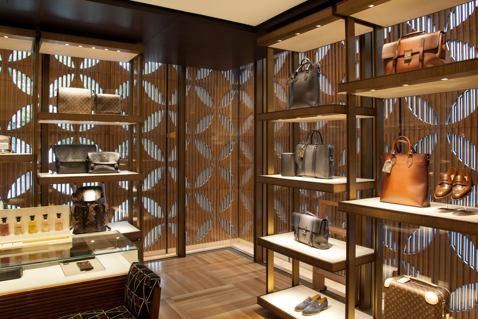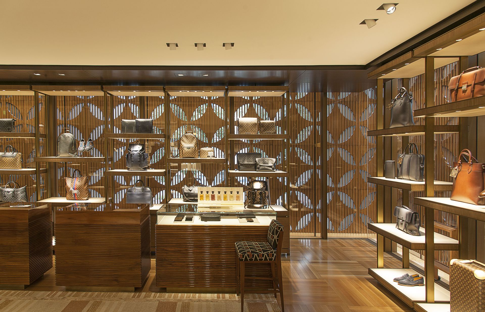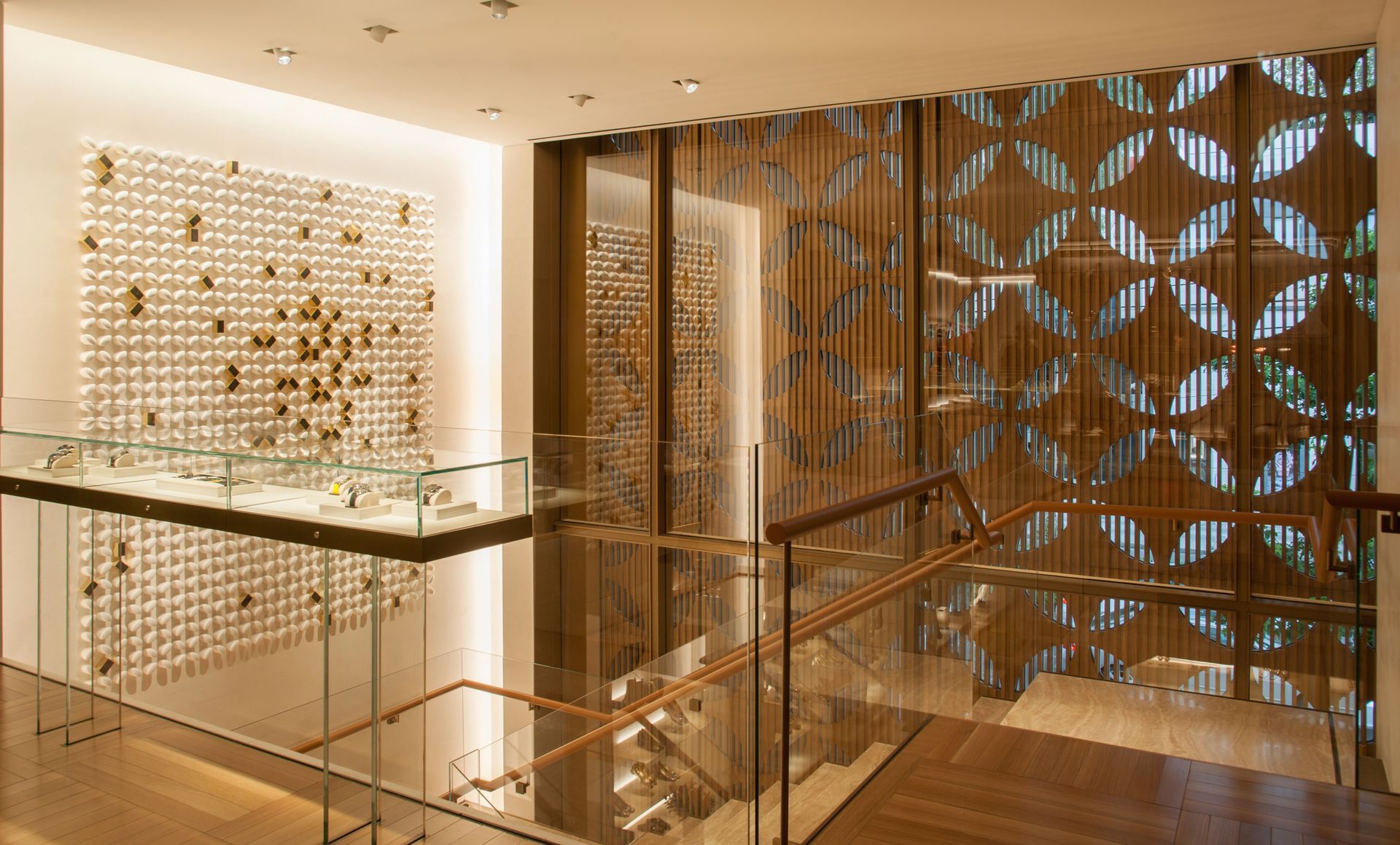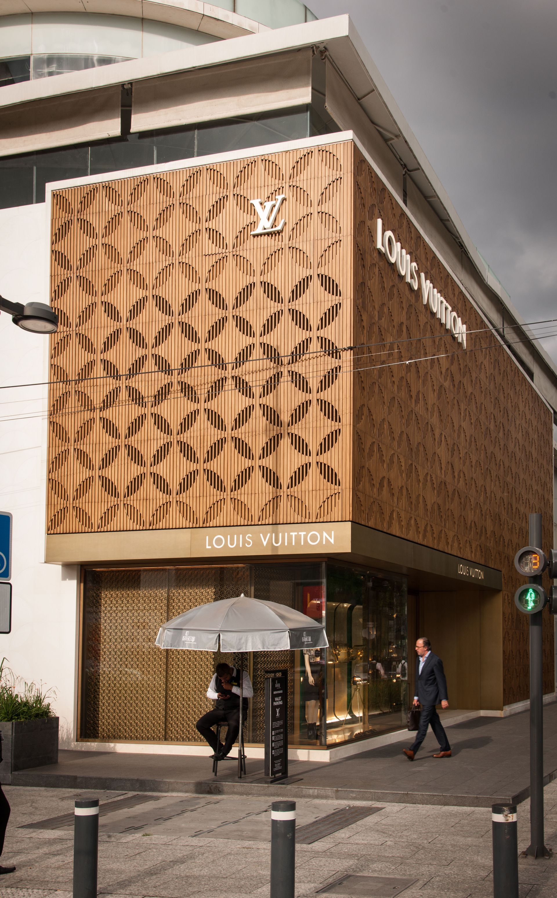 The project featured a kinesthetic façade inspired by the Louis Vuitton flower motif, integrating wood paneling that not only decorates but filters natural light and offers privacy while framing views of Masaryk Avenue.