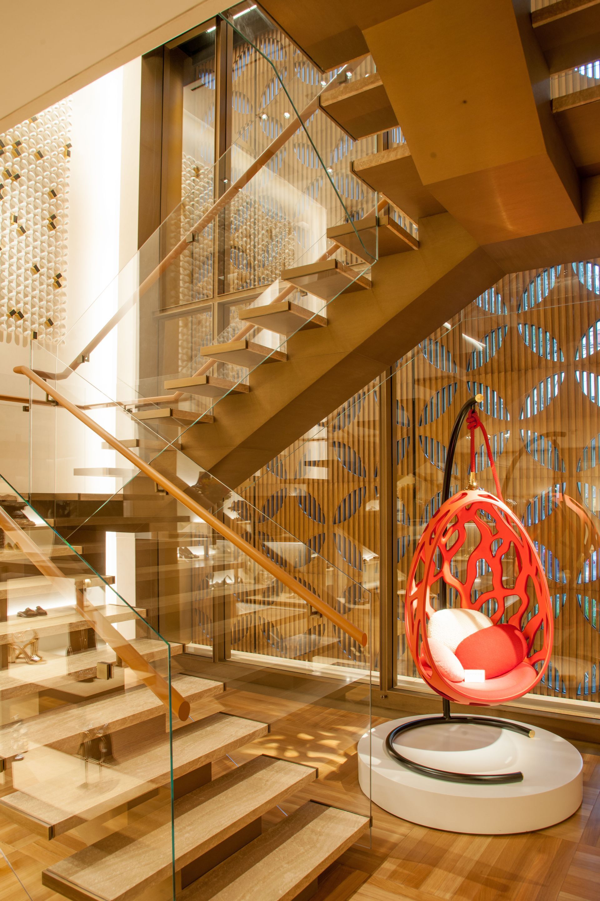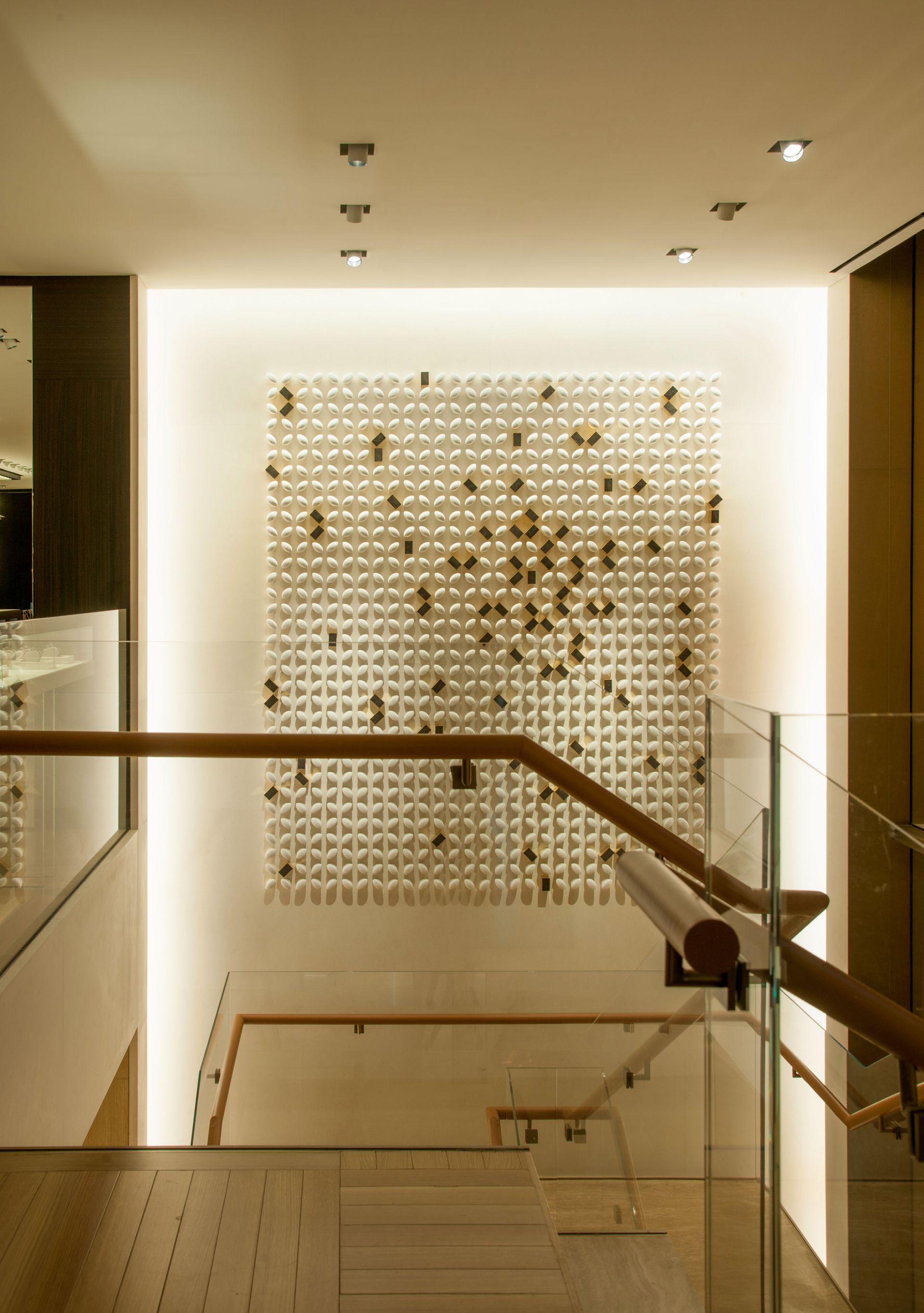 The façade acts as a continuous, soft cloth, reflecting the brand’s commitment to detail and craftsmanship. The interior combines various materials: wood in different tones to highlight collections, brass finishes, and limestone for a grand staircase. A feature wall includes artwork by Mexican artist Adrian Guerrero, and millwork adheres to PMA and Louis Vuitton’s standards. Local touch is added with furniture by Mexican designers.