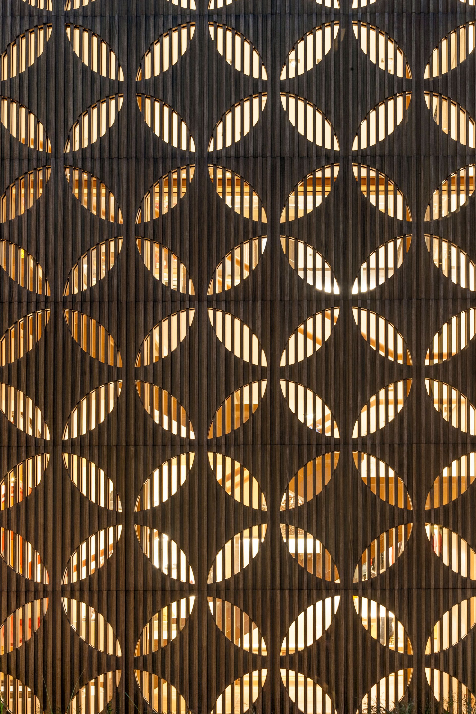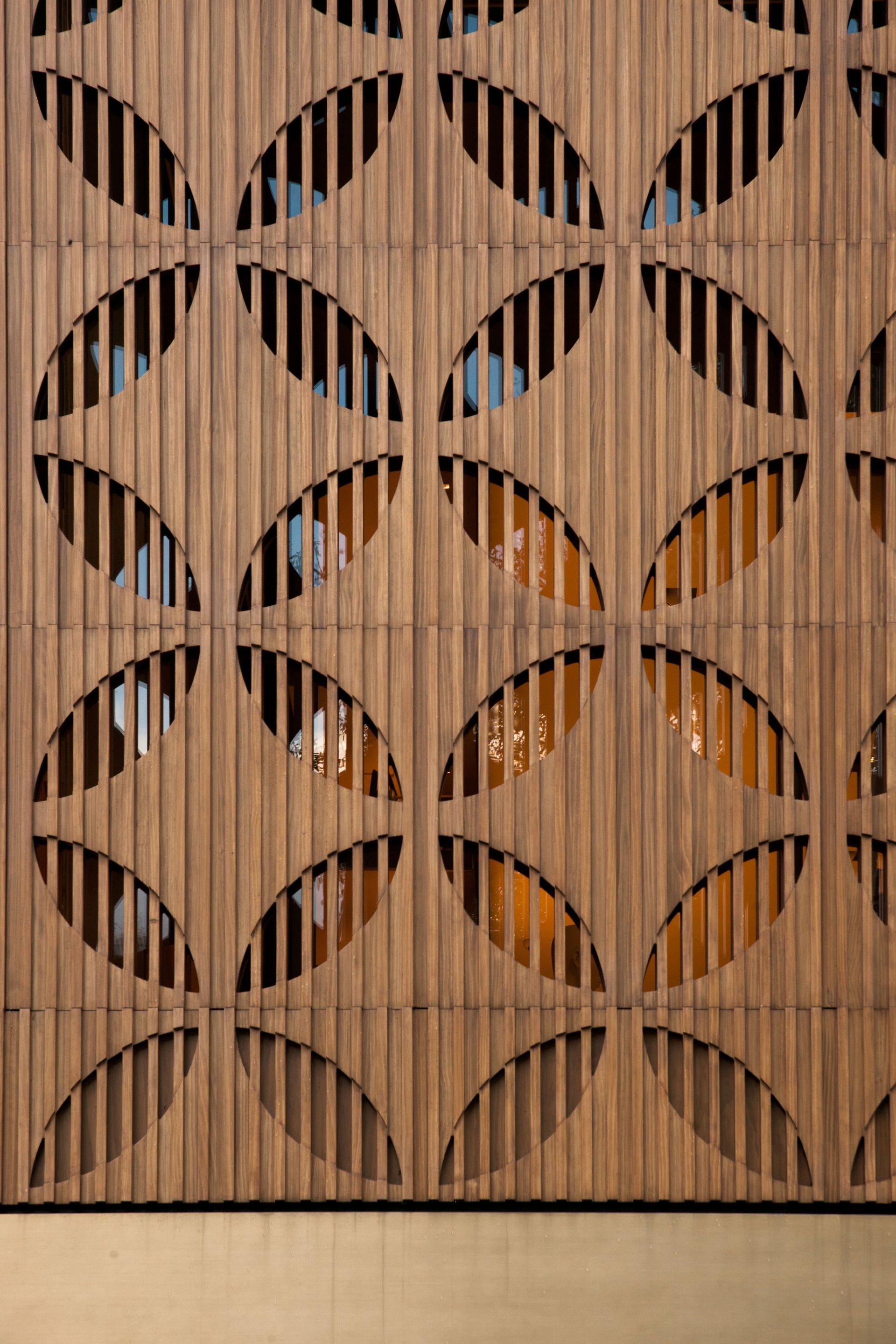 The structural system, hidden within the panels, uses a thin steel net for seismic resilience. The Accoya wood, a sustainable pine, was previously used by Louis Vuitton in their Cancun store, marking a continued innovative use of this material.