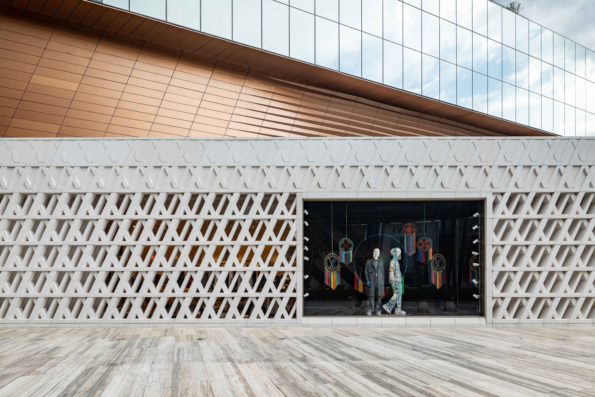 The façade, composed of over 700 prefabricated concrete pieces, creates a dynamic play of light and shadow, transitioning from solid to porous patterns. This design not only lightens the mass and highlights interior views at a pedestrian scale but also establishes the store as a visual landmark within the urban context.