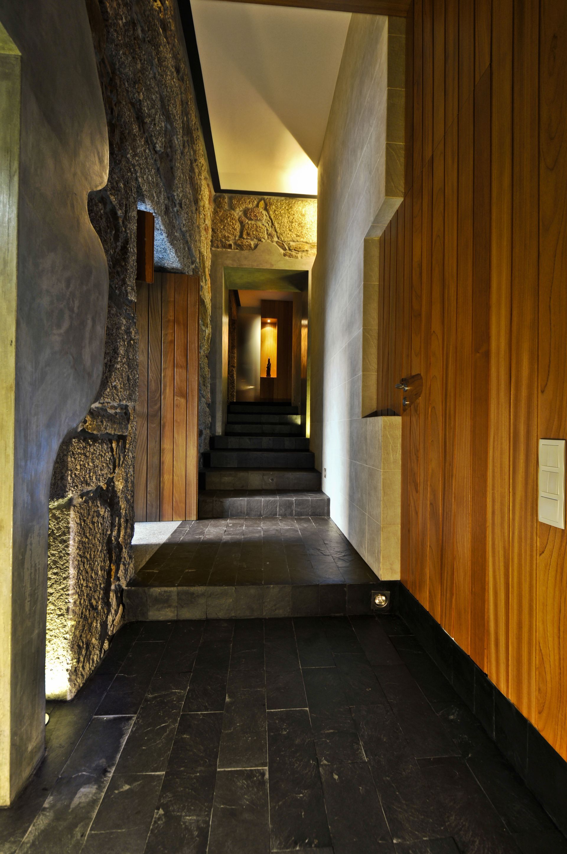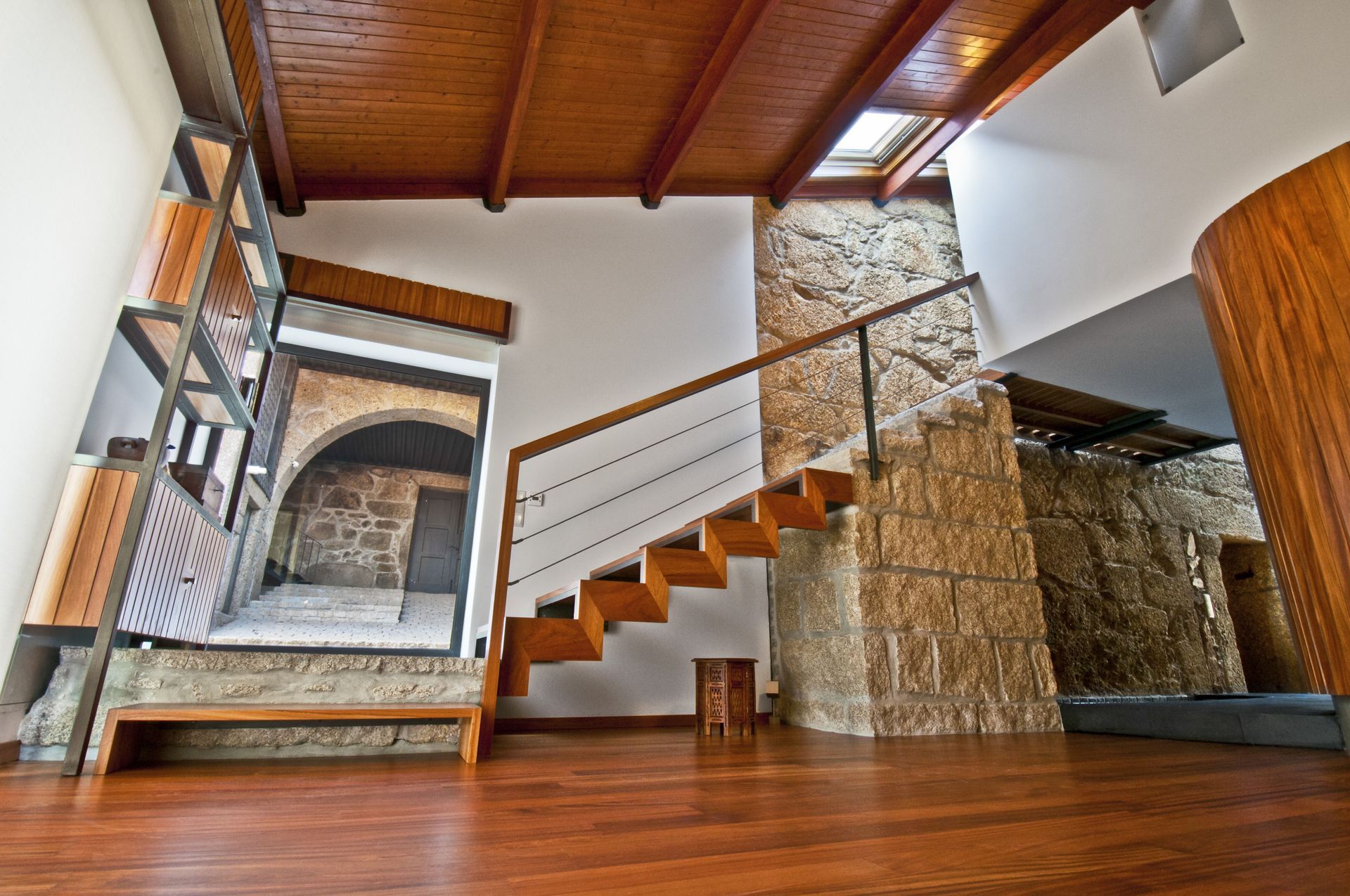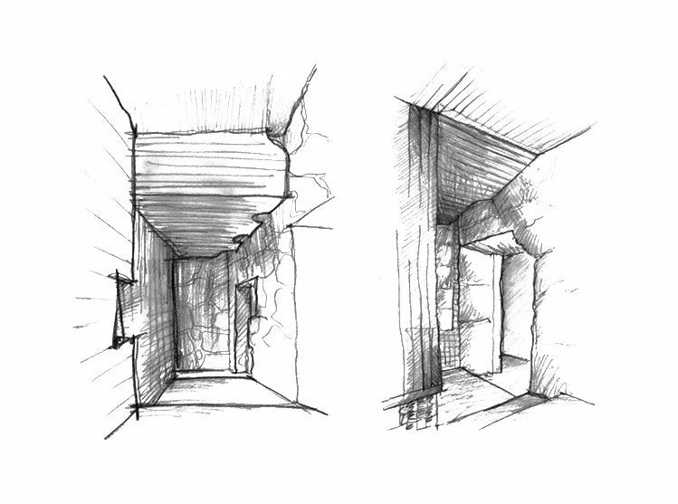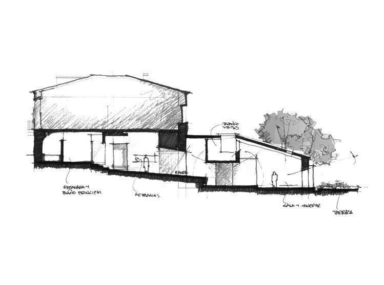 The house deals with a 300 yr. old structure that had to be mostly kept in its original state using the same materials to re-build the weakened structural elements.