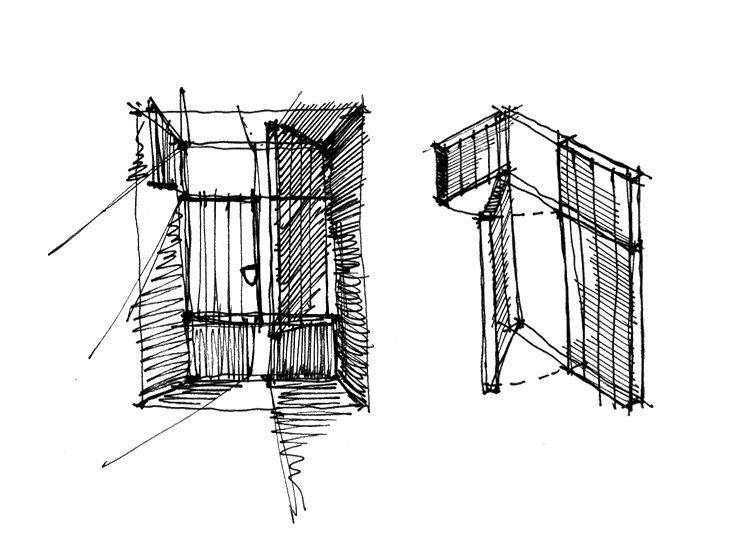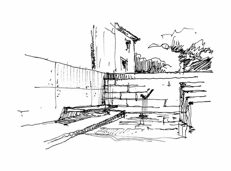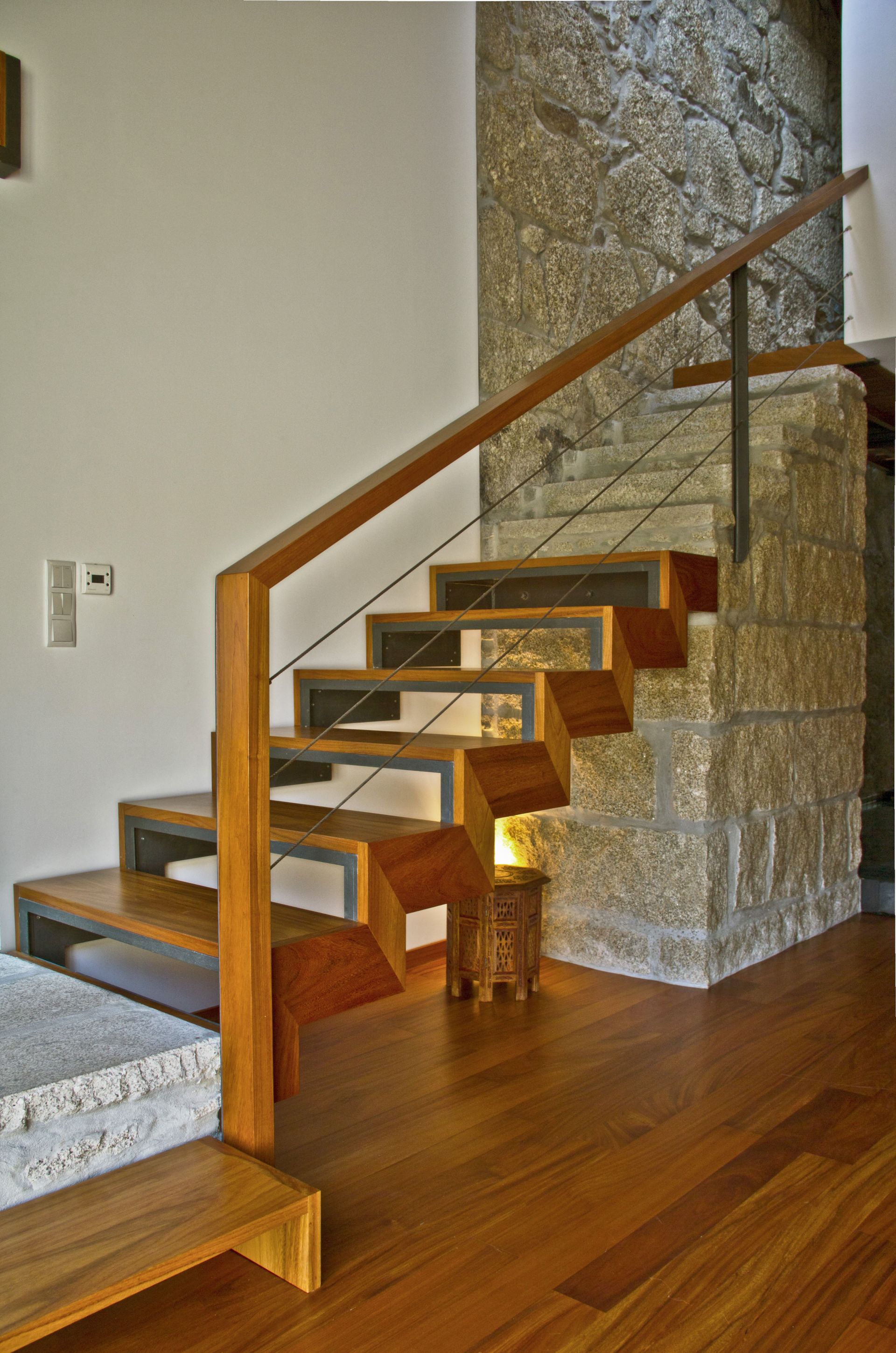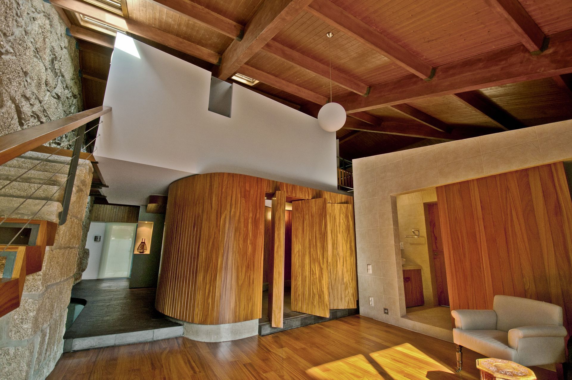 The house deals with a 300 yr. old structure that had to be mostly kept in its original state using the same materials to re-build the weakened structural elements.
