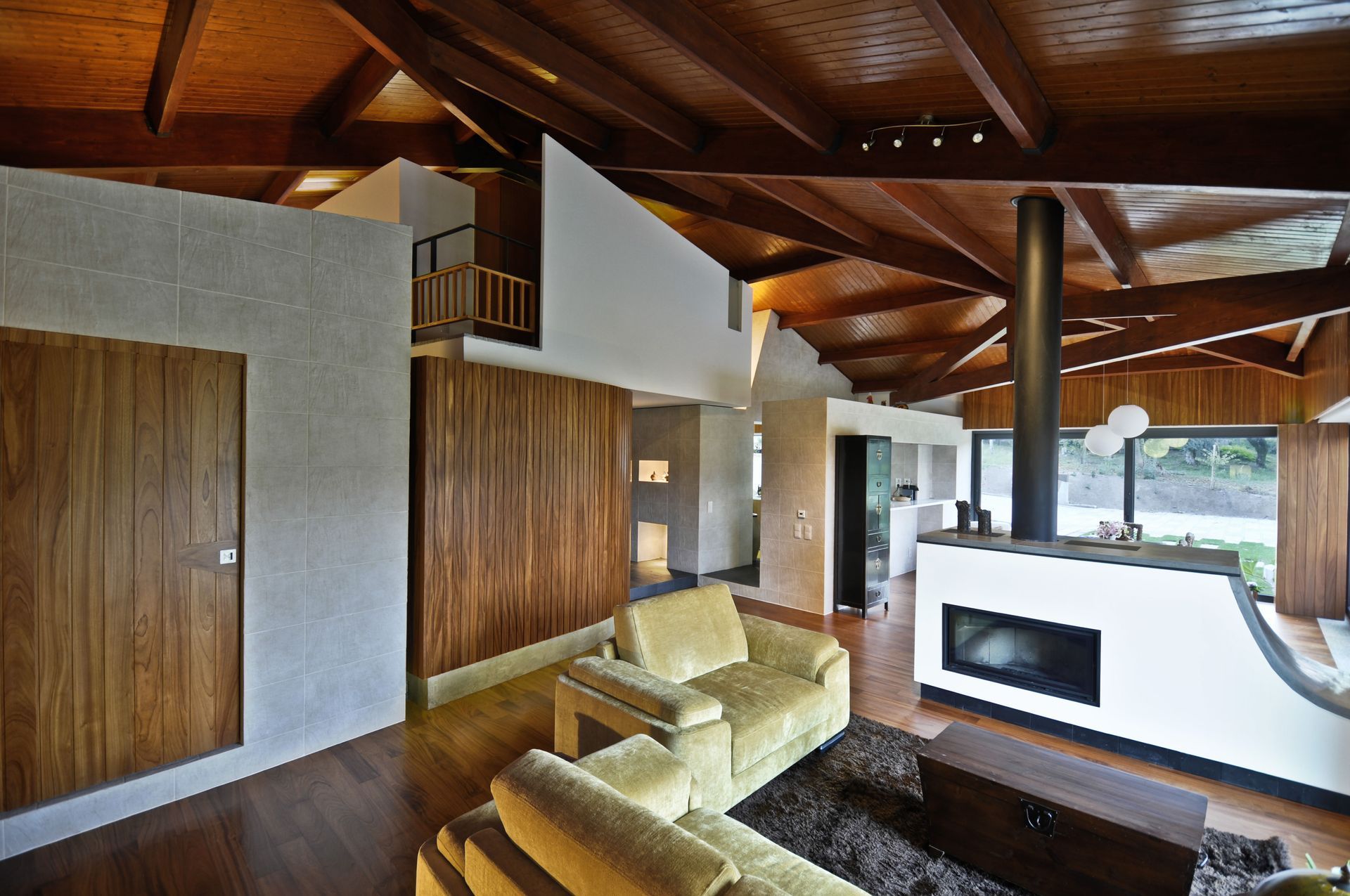 The design used local materials with a contemporary expression and a craftsmanship character. The public area of the house is shrouded by a double height wooden roof. The roof acts as an integrator of the spaces below, providing a sense of continuation. Small volumes containing support functions such as the kitchen, bathroom, and gym were located beneath the roof.
