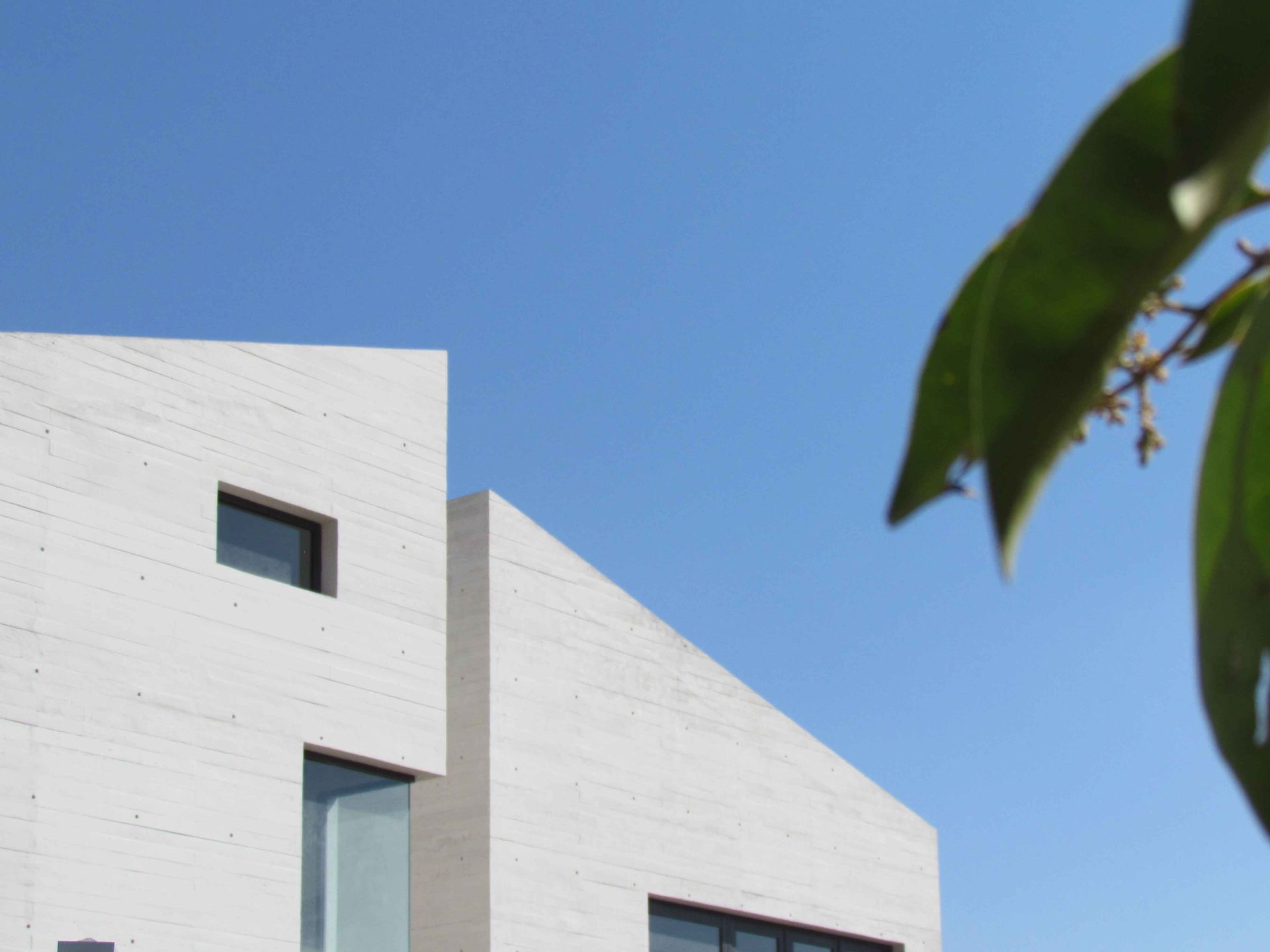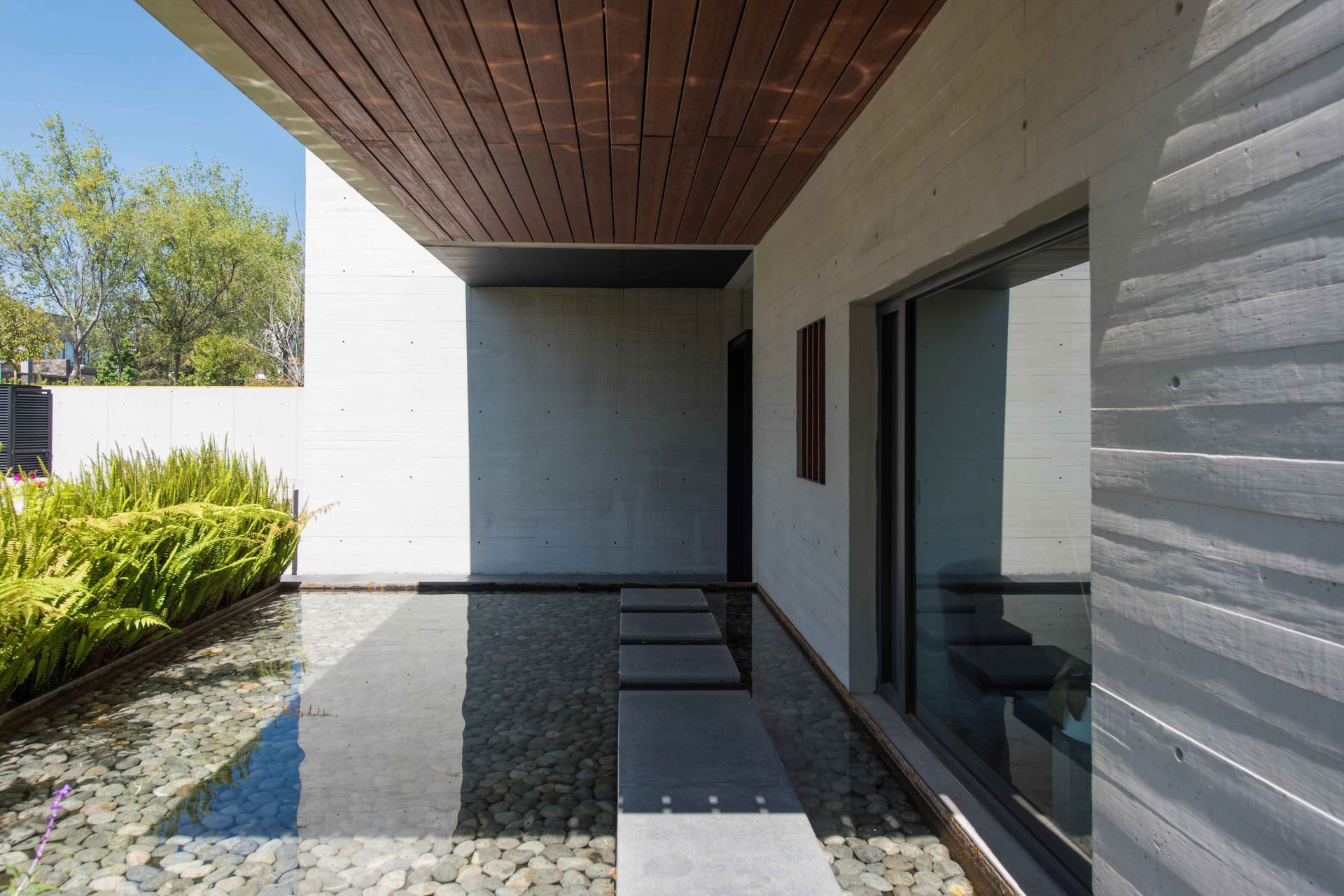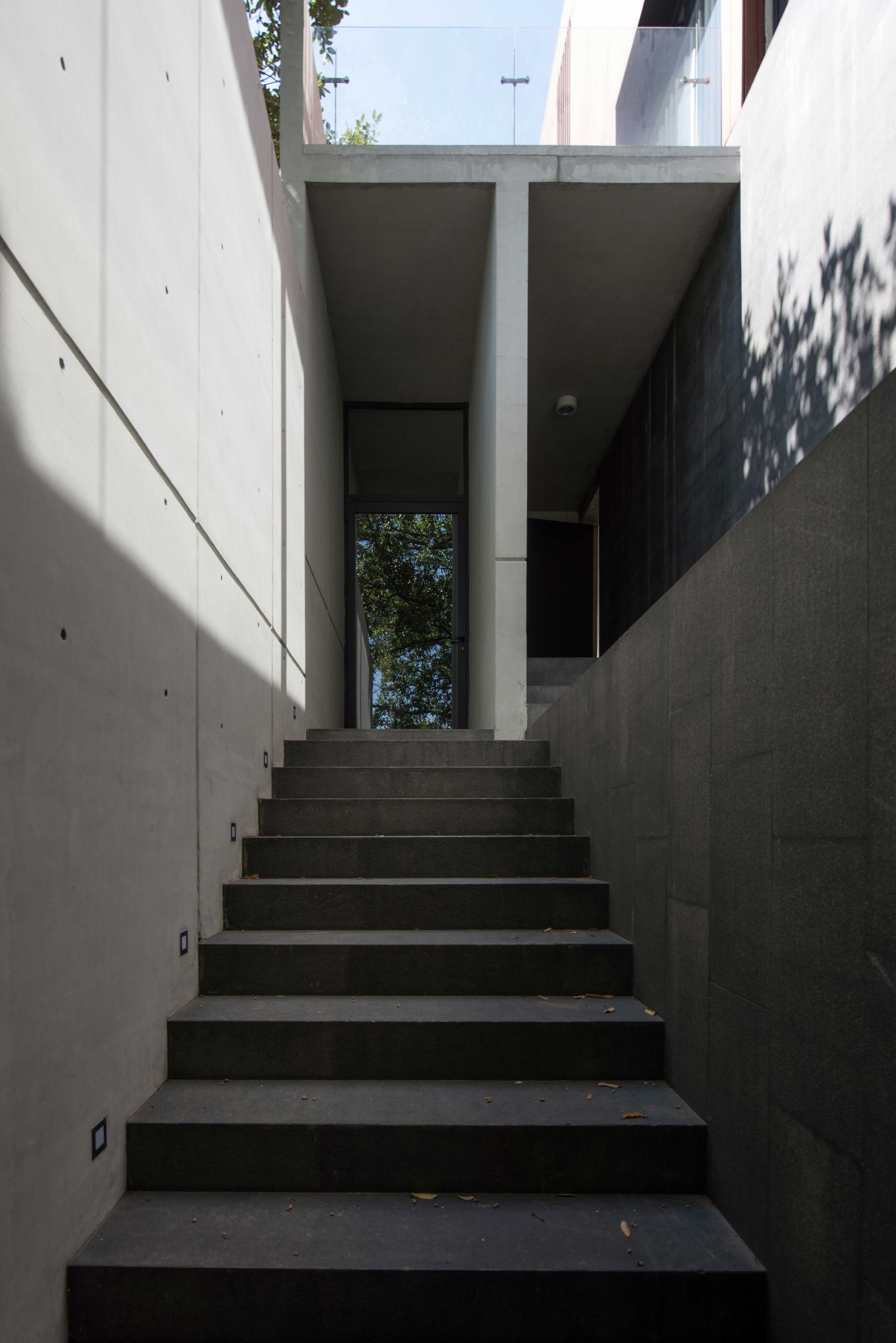 The first level of the house blends into the site’s natural topography. Communal spaces are placed above it, where heavy concrete walls are replaced with glass to create a dialogue between the interior and exterior elements. The third volume, containing the private spaces, is emphasized as it cantilevers above the site.