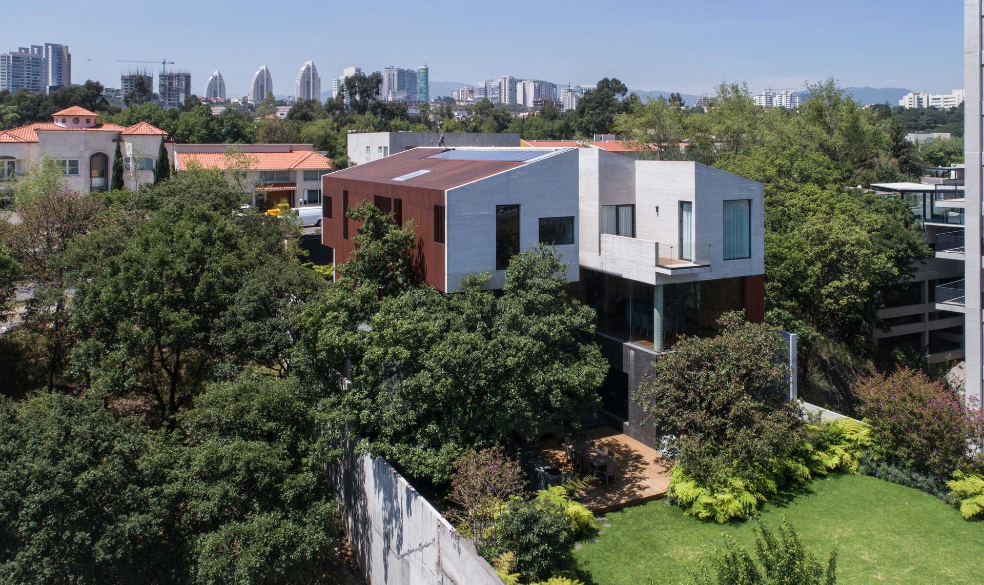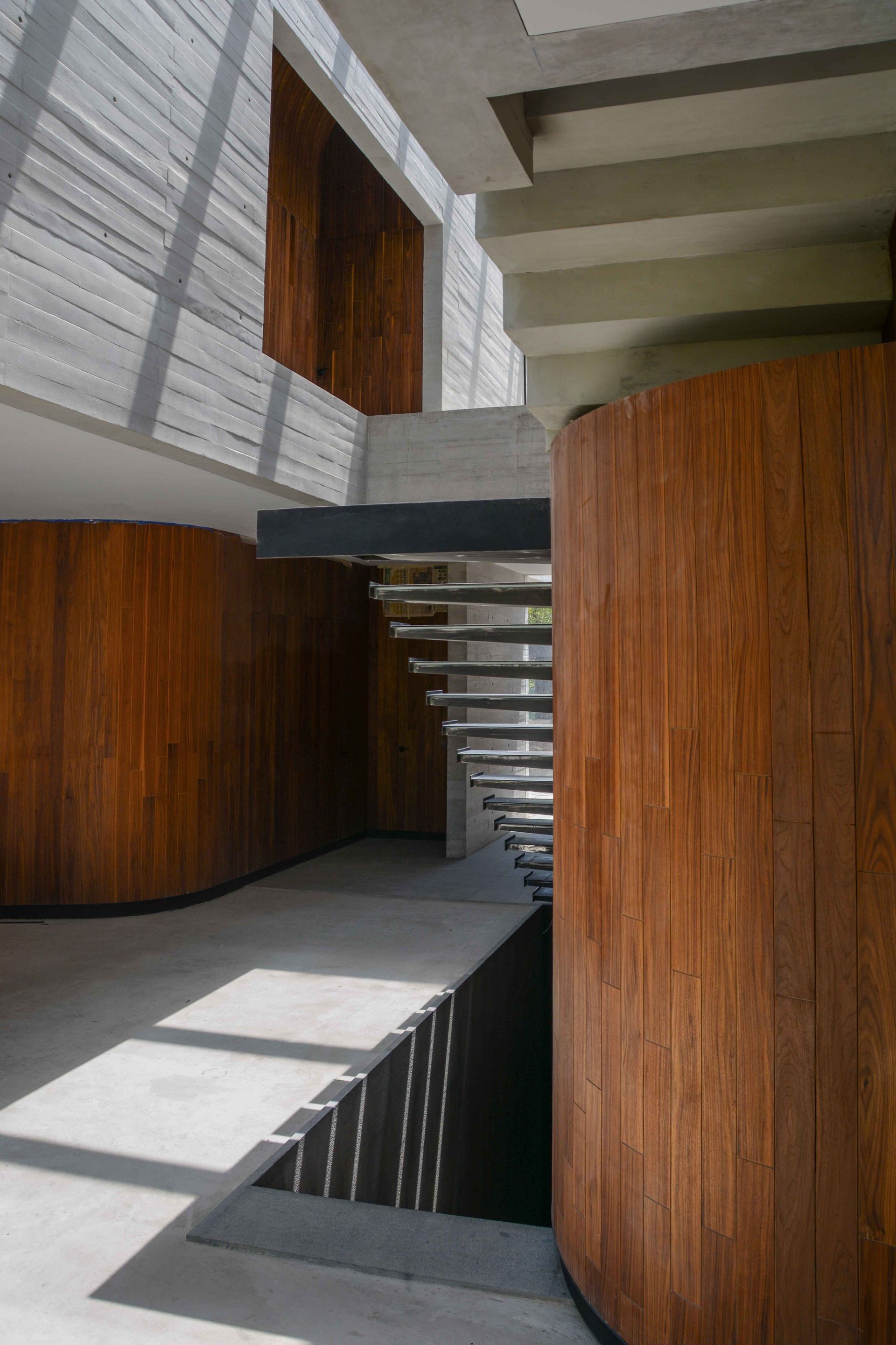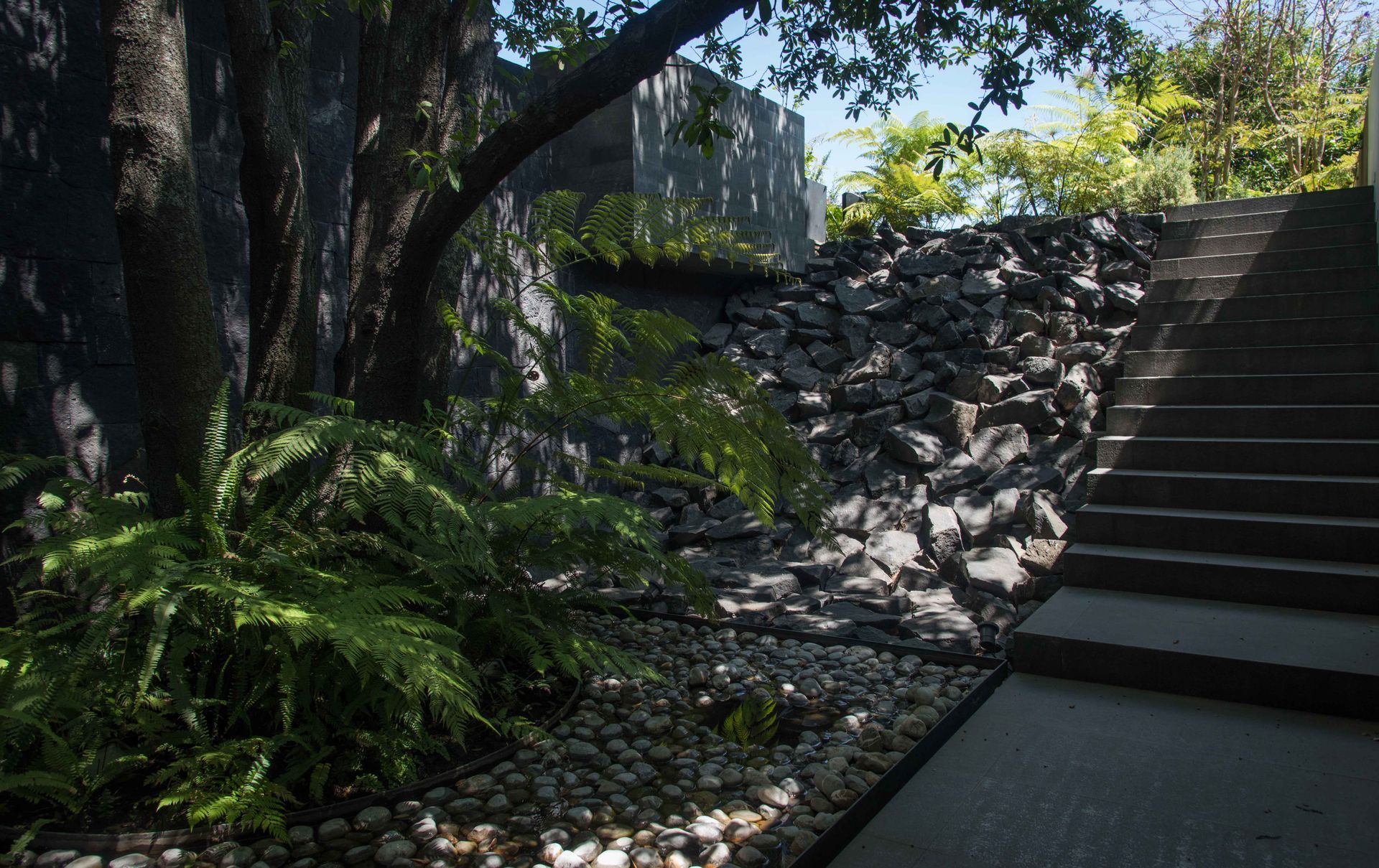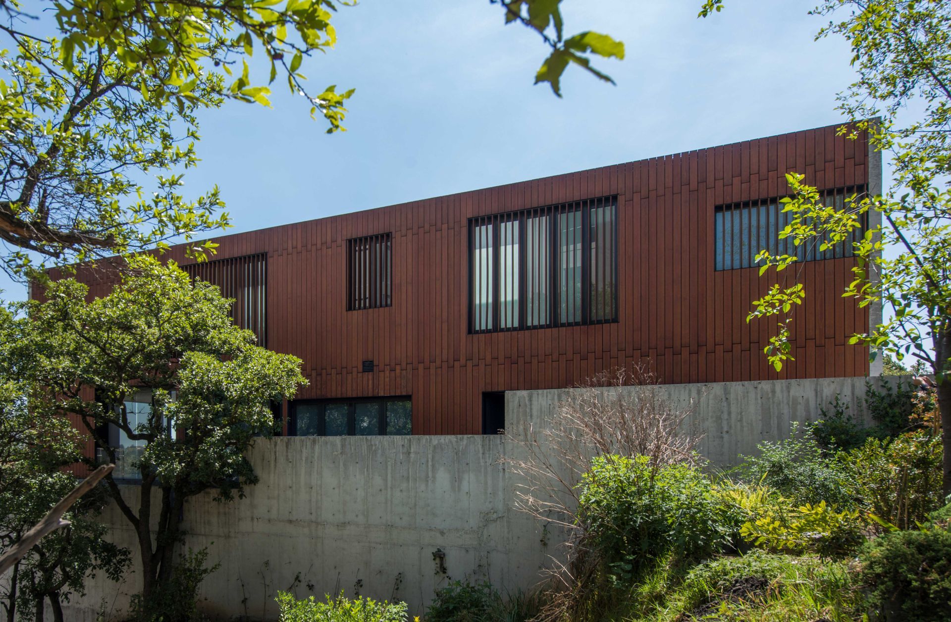 The first level of the house blends into the site’s natural topography. Communal spaces are placed above it, where heavy concrete walls are replaced with glass to create a dialogue between the interior and exterior elements. The third volume, containing the private spaces, is emphasized as it cantilevers above the site.