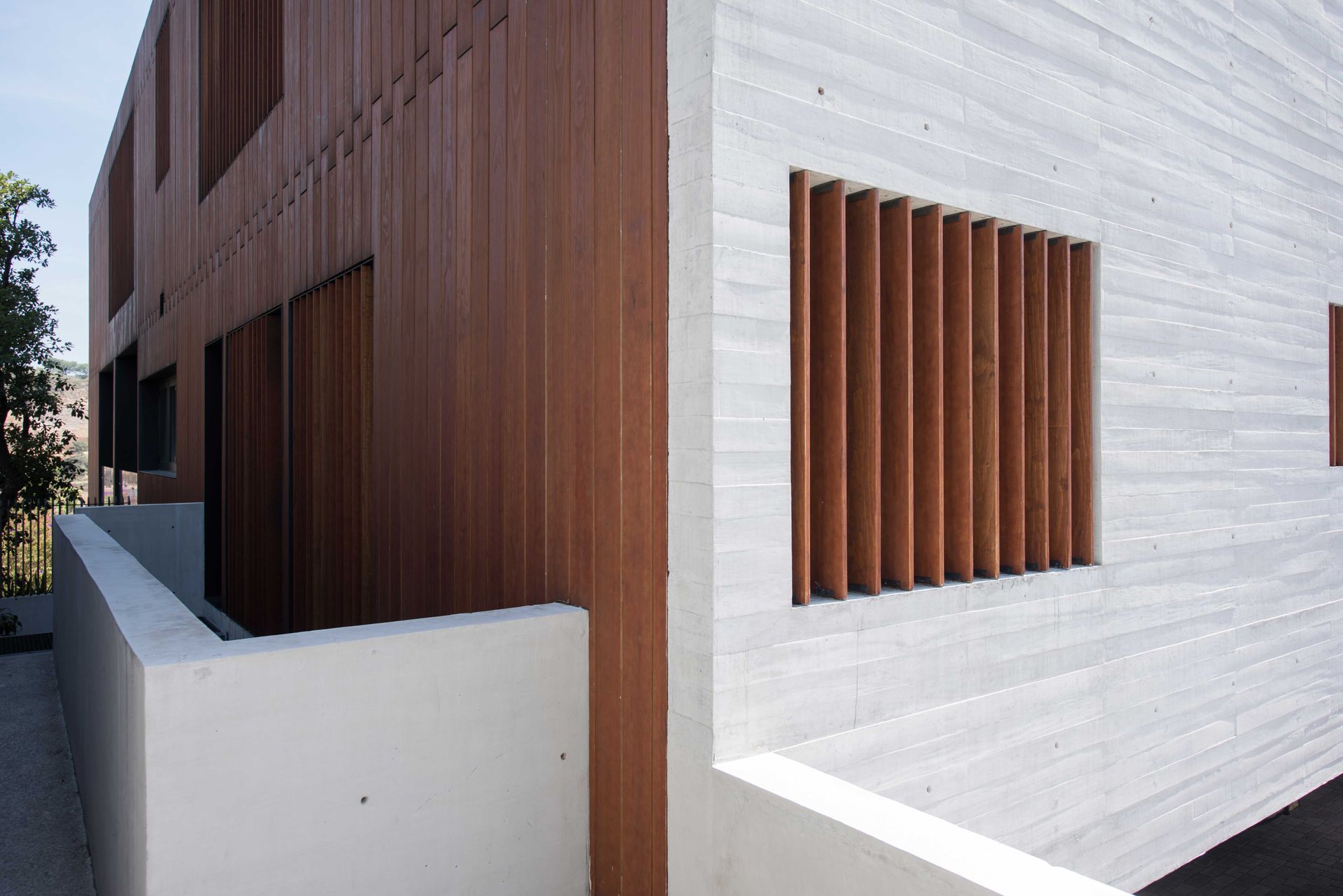 The box encloses two separate transparent volumes. The stairway frames the only façade, which plays with different textures embedded in concrete, wood, and stone. The enclosing surfaces are interrupted to introduce natural light and views. A continuous wooden skin envelops the volume, accentuating the edge between the walls and the roof.