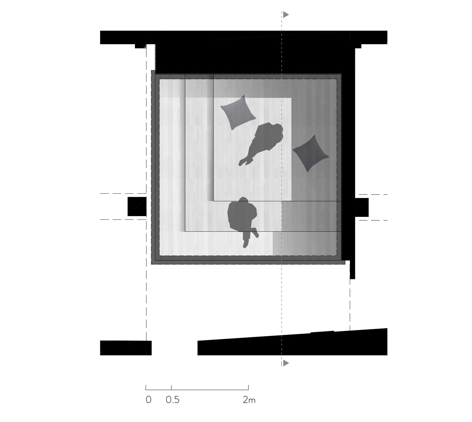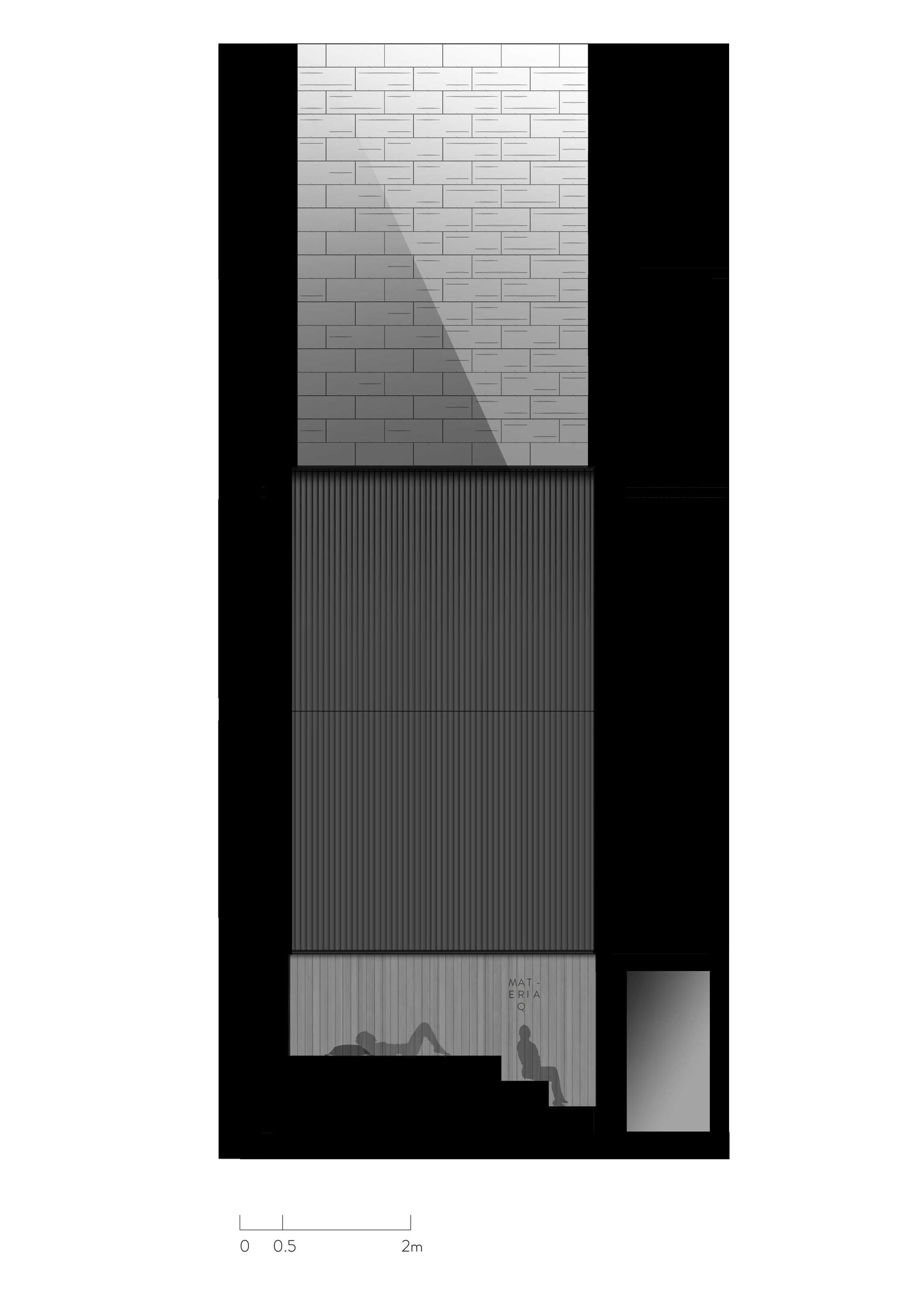 The space displays contrast between materials (metal and wood), maintaining their colours and varying in textures to provide pauses of light and mapping time.