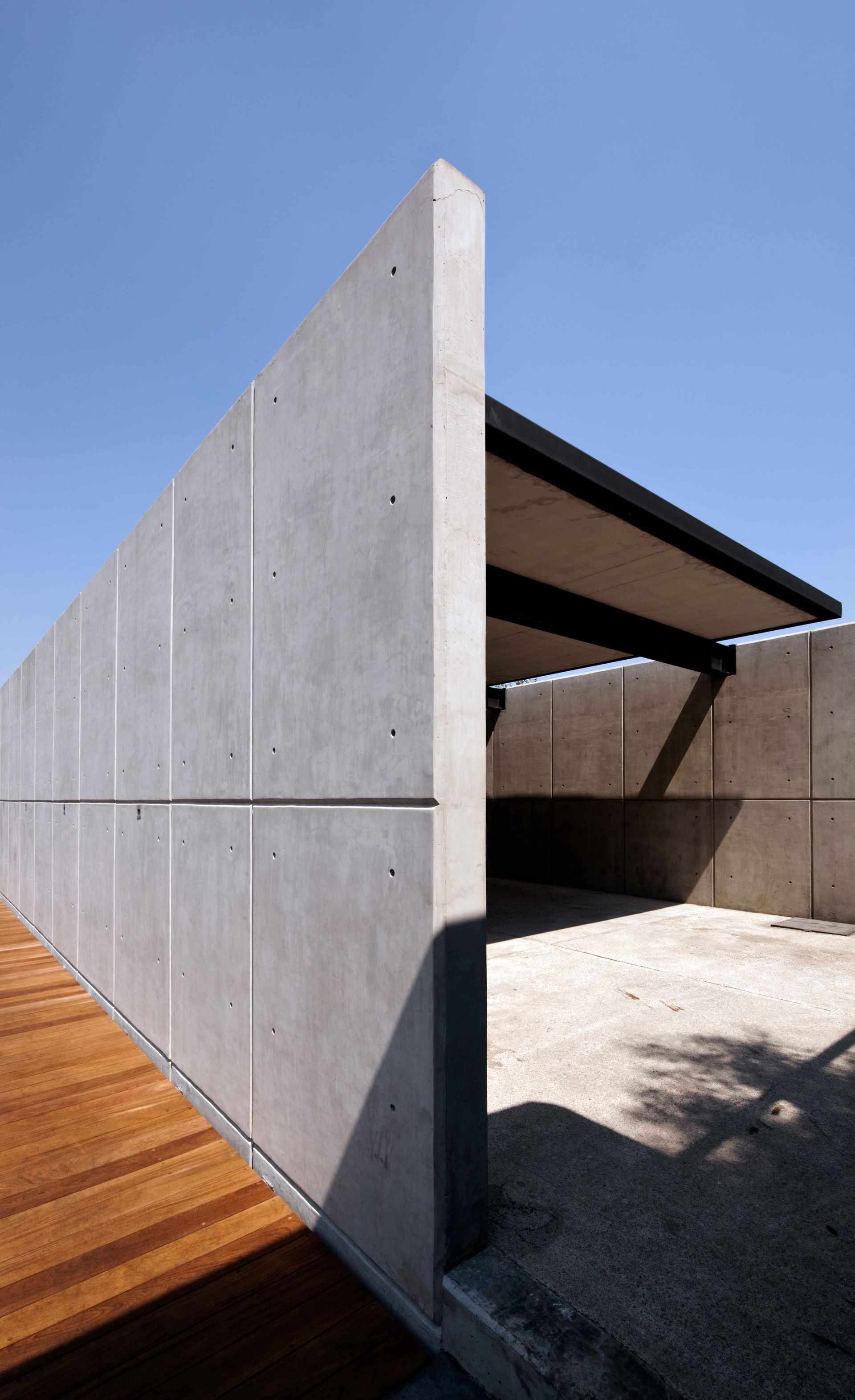 Materials vary by function: concrete for service areas, black stone for social spaces, and white finishes for bedrooms. The landscaping integrates seamlessly with the site."