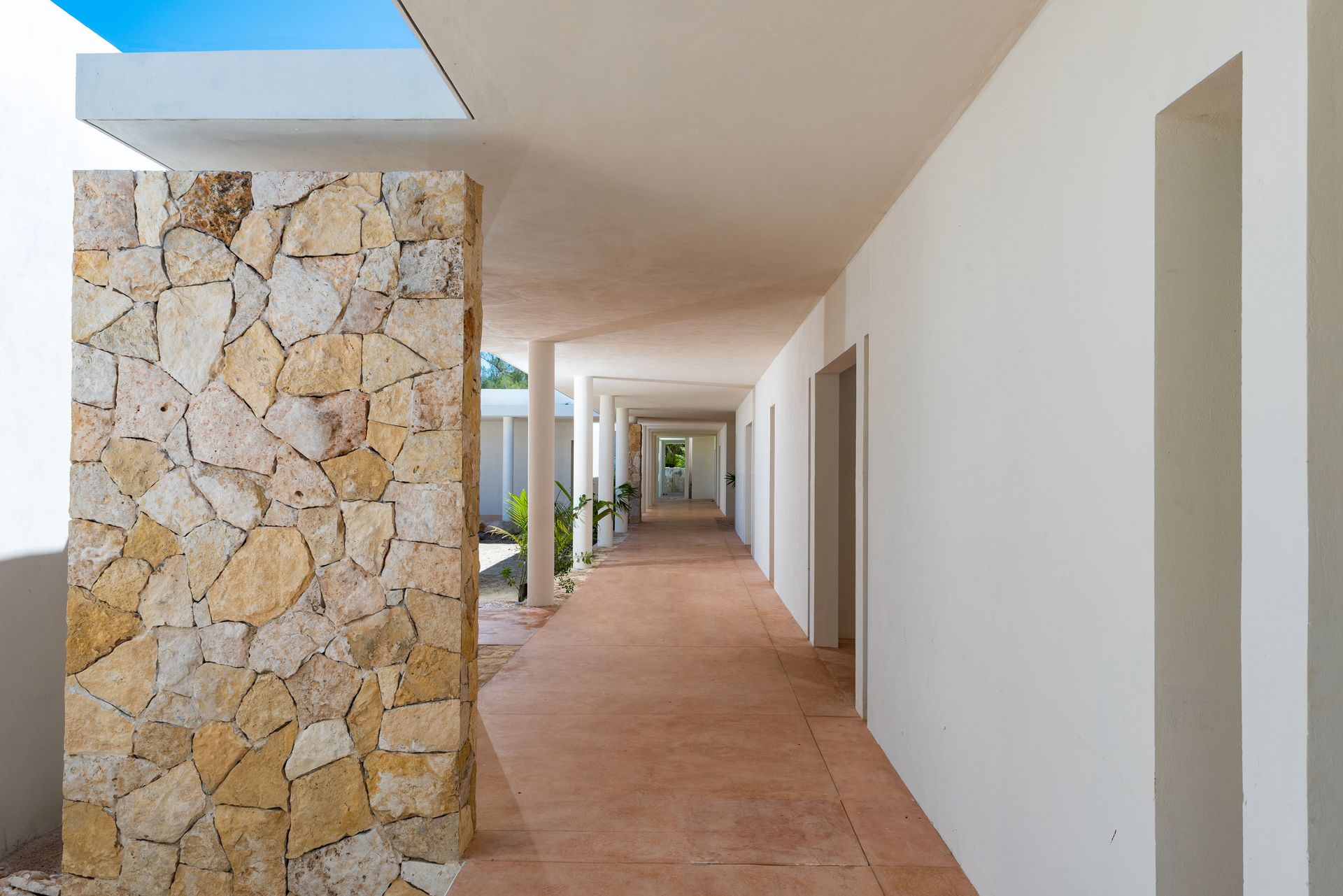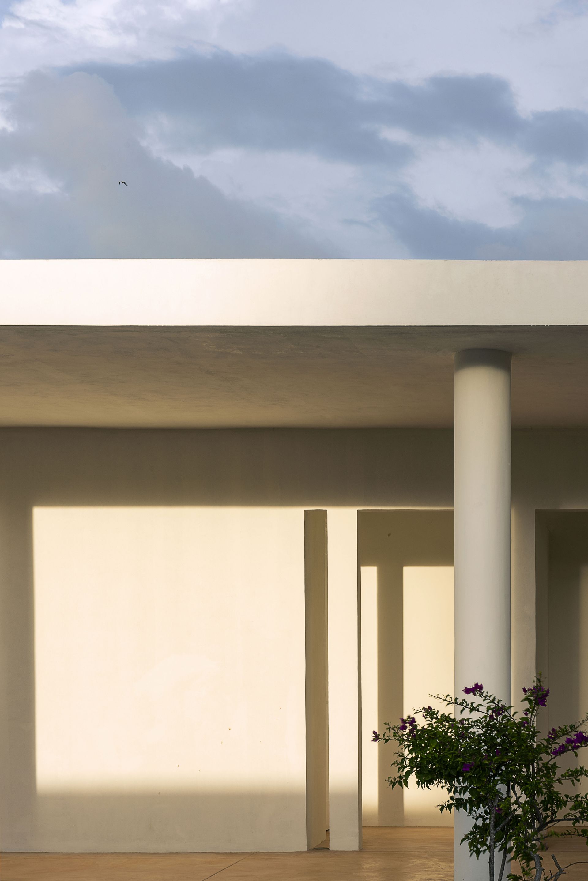 surfaces, using light and shadow to frame views. The retained portico and colonnade establish a rhythm and provide circulation and private terraces. The horizontal slab connects the house to the ocean’s horizon, enhancing its scale.