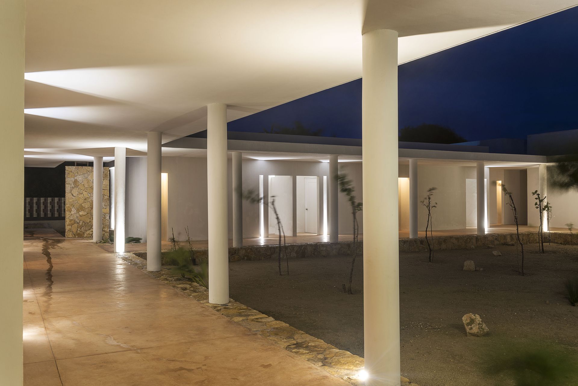 The new design honors the L-shaped layout of the original house, completing it to form a hacienda-like patio. The expanded home now includes 16 bedrooms, a multifunction room, dining, living, kitchen, and terrace spaces, all reflecting the character of the original structure. The architecture employs a simple language with careful attention to volumes, depths, and