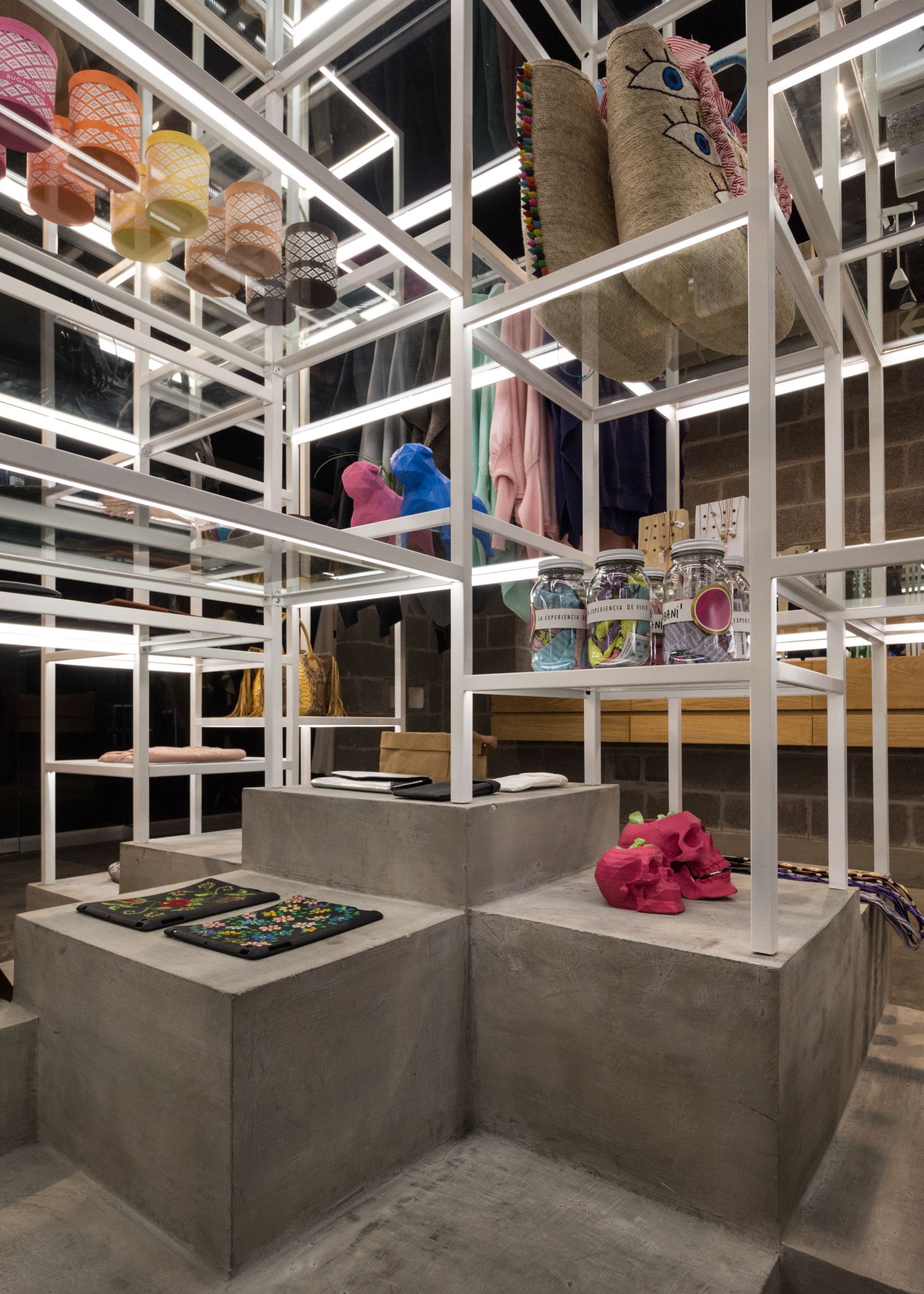 The design of the new store breaks the traditional scheme where there are multiple pieces of furniture for the various products and is transformed into a single three-dimensional piece that generates spaces for living in a diverse collection and in constant interaction with people. CAÑAMIEL is a space of contemporary attitude for the identity and expression of each person and product.