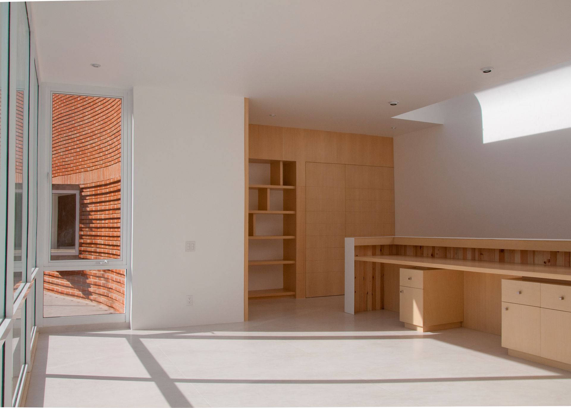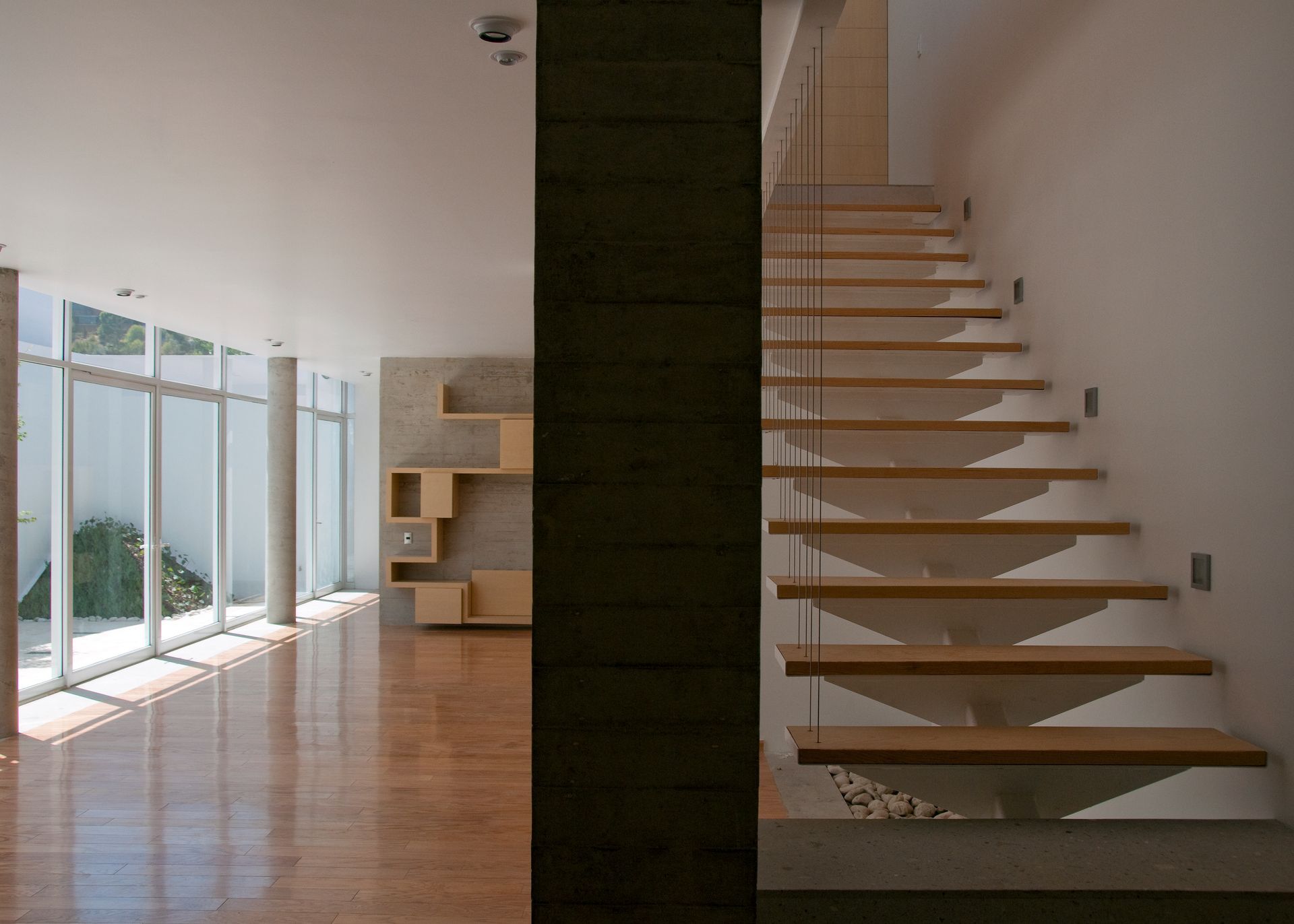 The main structural elements of the house are made of exposed concrete acting like independent floated volumes that also modulate the sequential changes in the house, such as the stair and entry vestibule. Wood is used in planes and surfaces that integrate fixed furniture, storage areas, and door thresholds into the architecture.