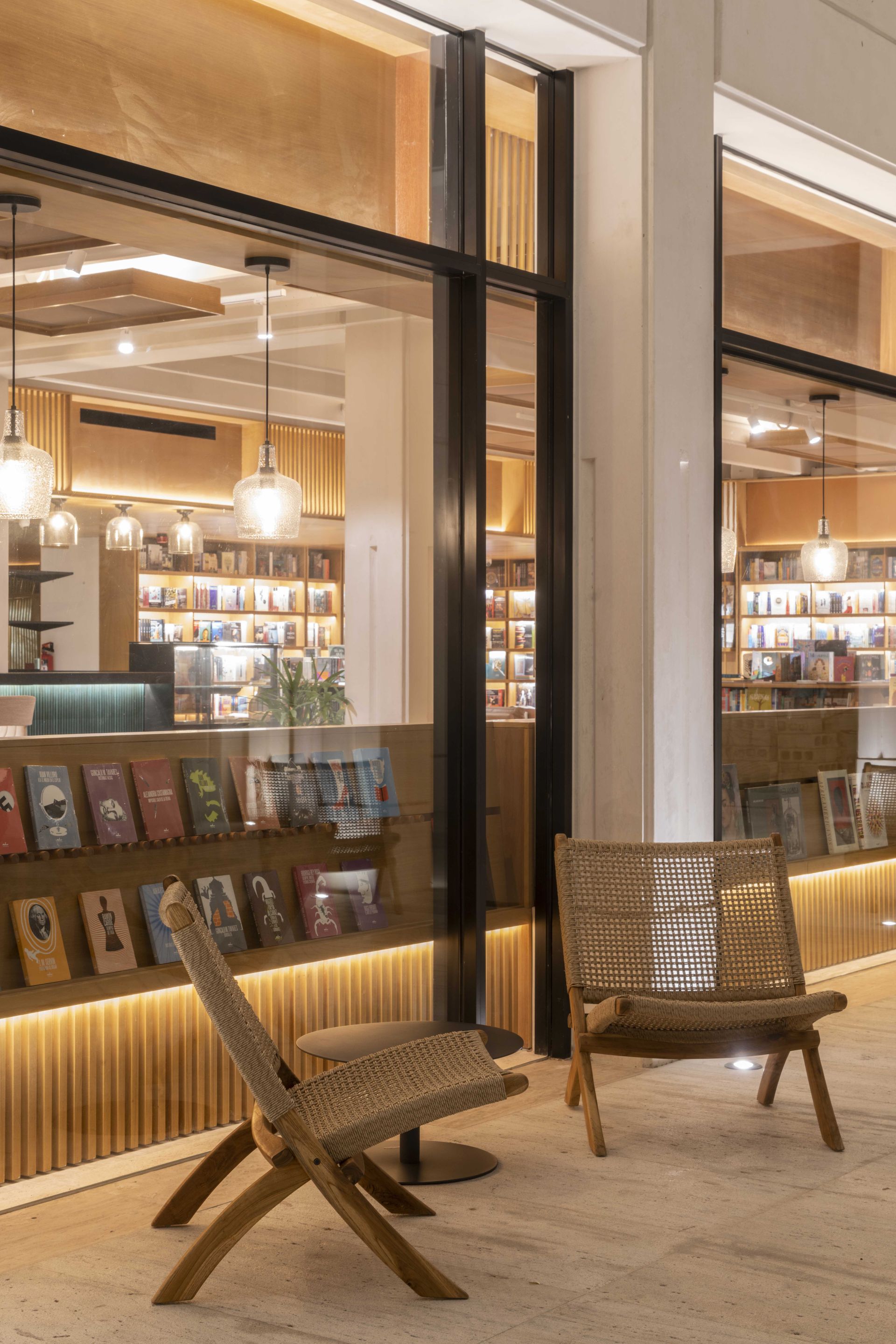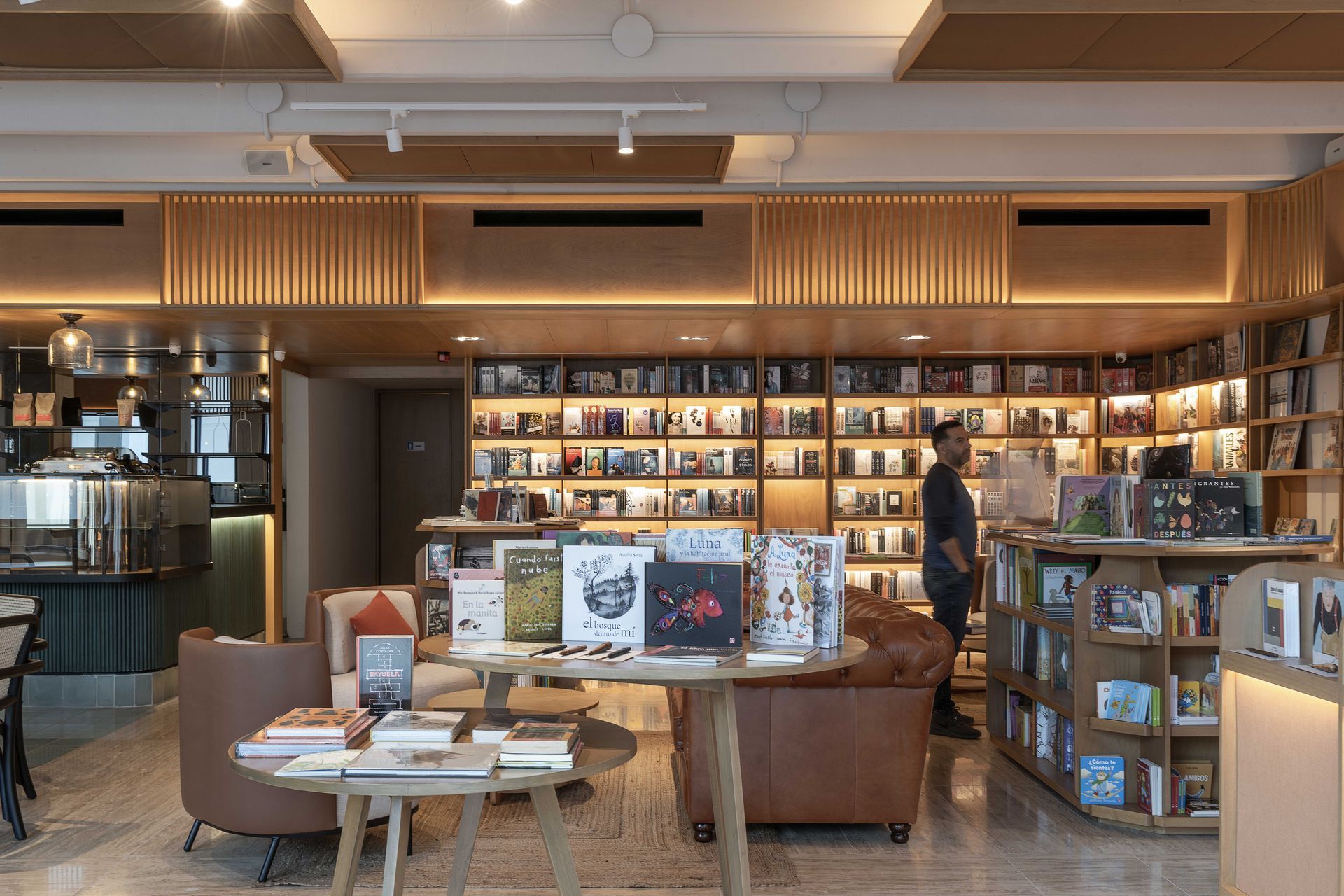Inside, the architectural structure is celebrated with exposed columns and slabs, creating a dialogue between past and present. The material palette combines concrete with warm wood, which forms a perimeter soffit. This soffit serves multiple functions: it incorporates built-in bookcases, display niches, and screens that filter natural light while transitioning into floating wood and textile frames for acoustic control and indirect lighting.
