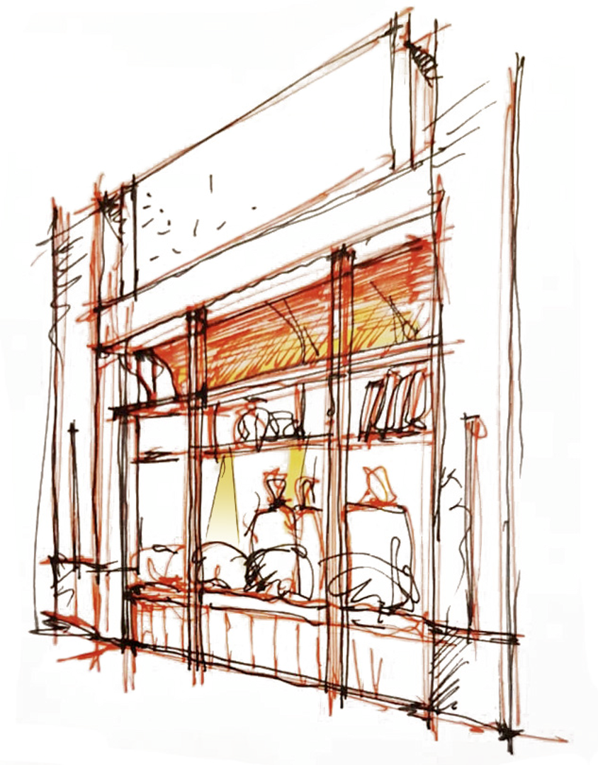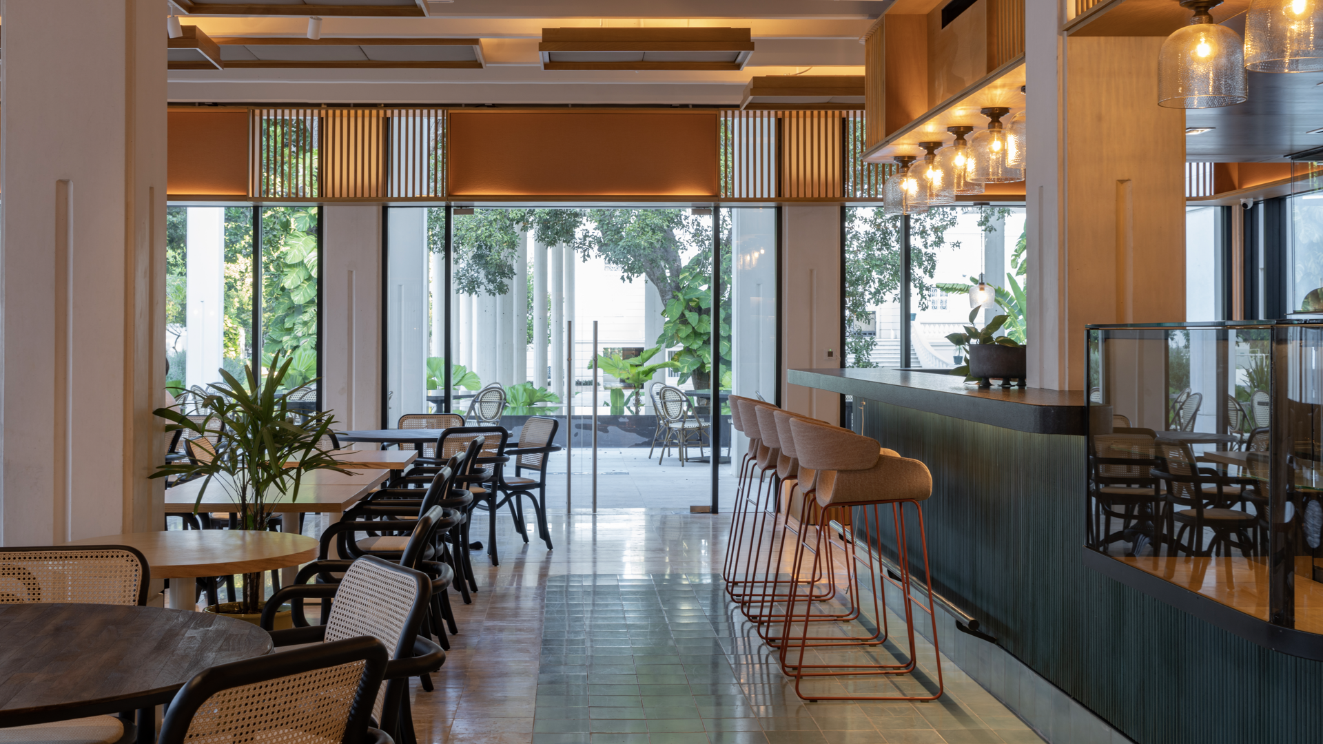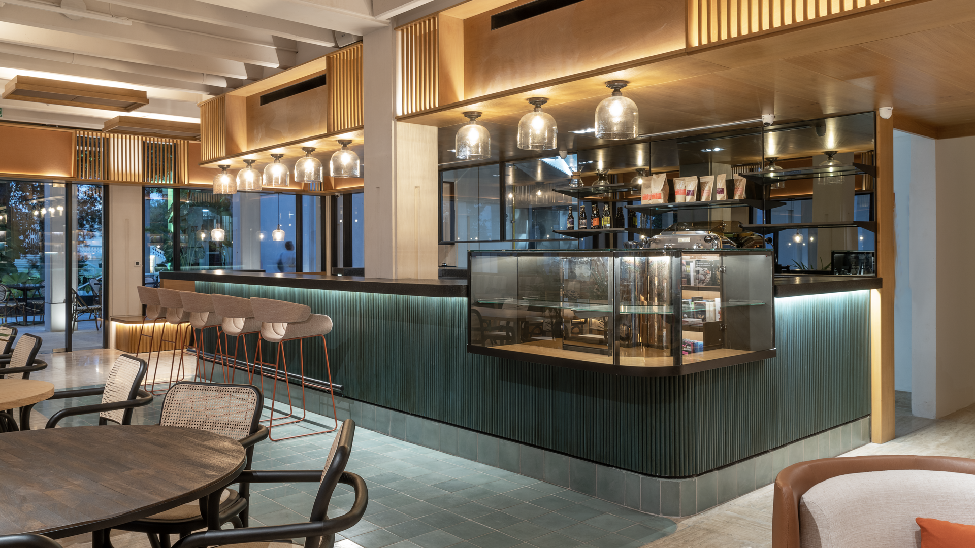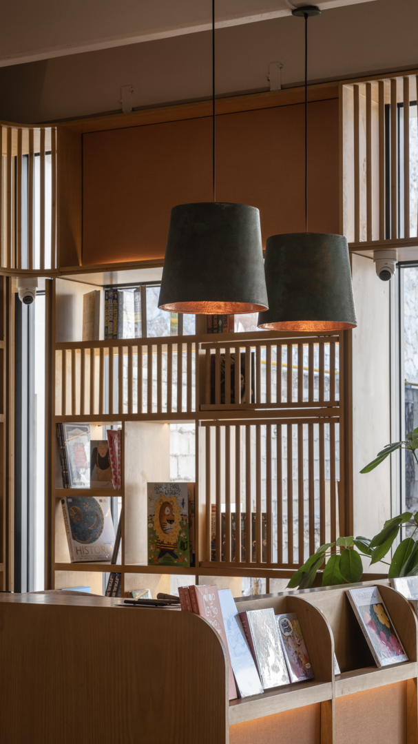 The central bar is a focal point, integrating a see-through kitchen window, eating stalls, a bakery display, and a coffee bar. Vibrant floor tiles and wood siding accentuate the bar, anchoring the space. Seating booths along the windows double as book displays with movable shelves. The design seamlessly connects historical references with modern aesthetics, fostering a vibrant and inviting atmosphere that encourages community interaction and cultural engagement.