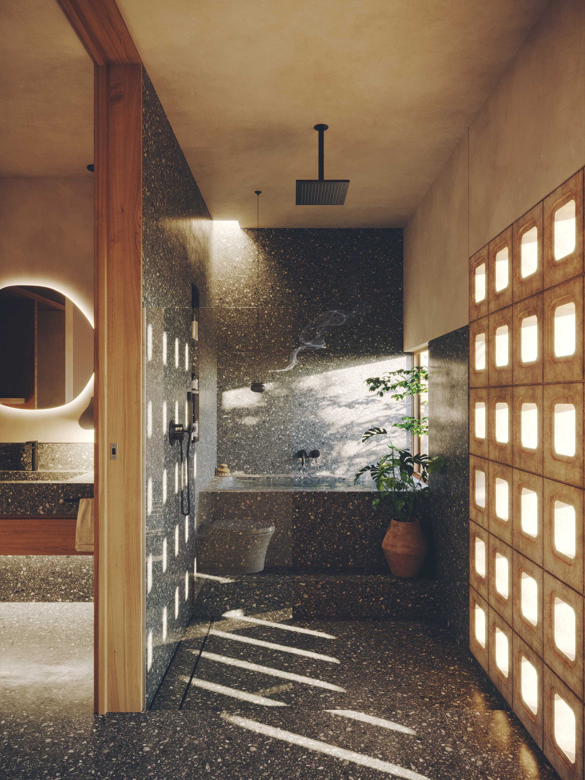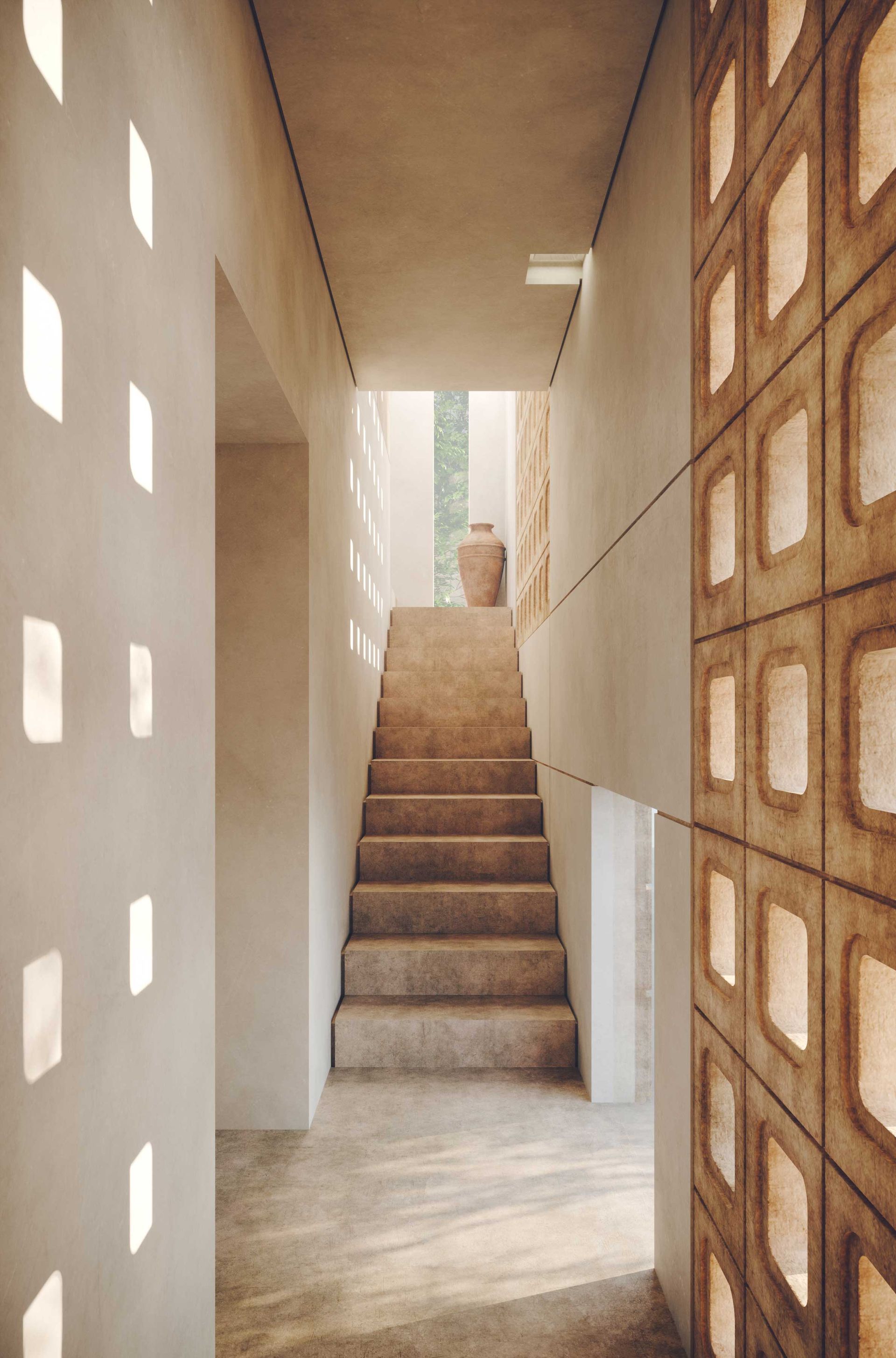 The project’s tectonic approach features custom-made masonry blocks and exposed concrete in a variety of forms, from solid to patterned and perforated units. This variation in texture and transparency creates thresholds that filter light while generating a dynamic spatial experience within the villas. The perforated blocks, in particular, act as intricate filters, casting delicate patterns of light and shadow throughout the interiors, enhancing the sensory experience of those inside.