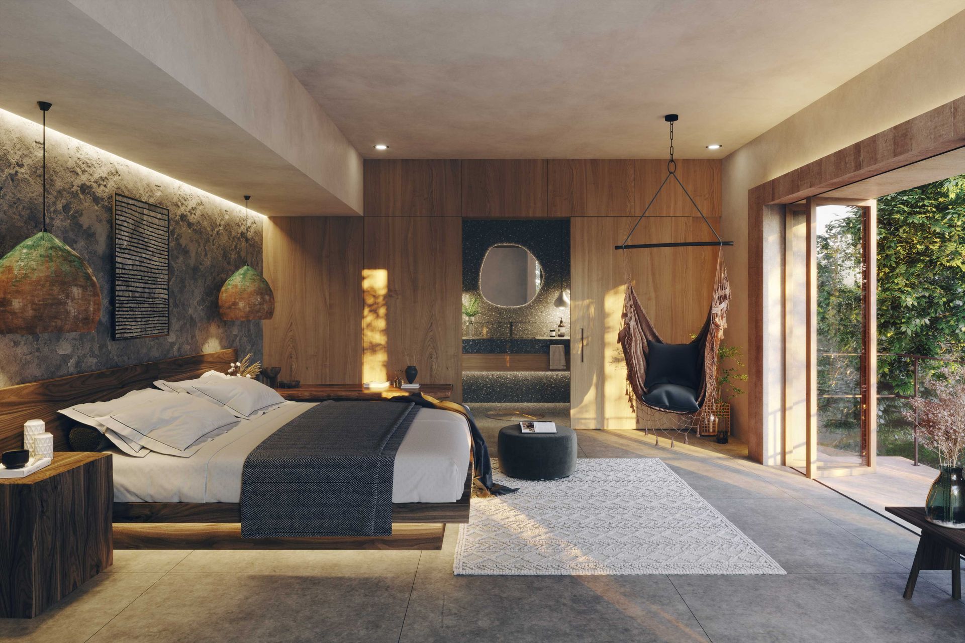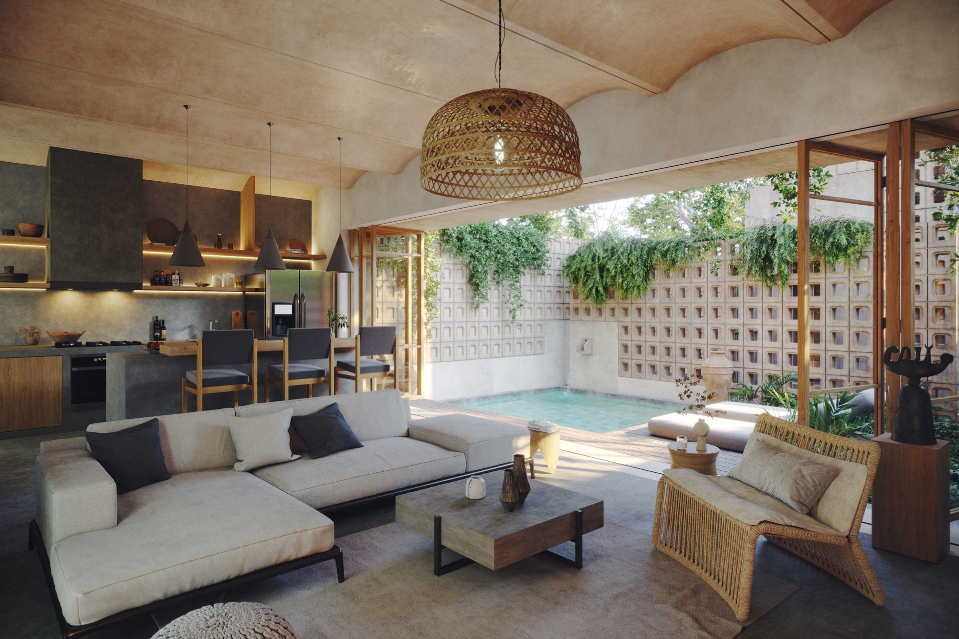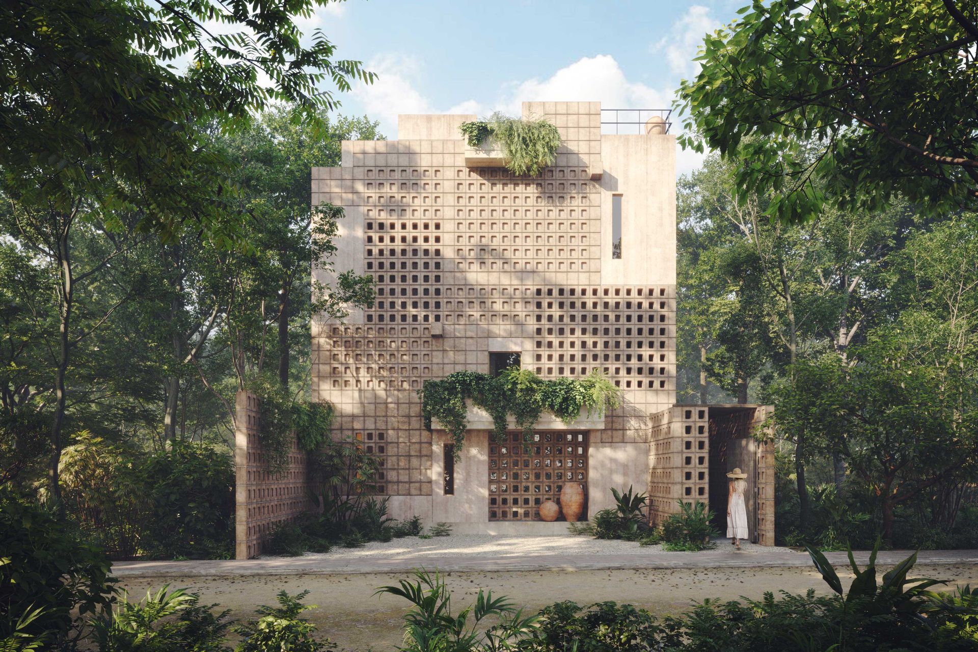 The architectural concept highlights the connection between built spaces and nature. Screen-like walls and strategically placed openings filter natural light and frame views of the trees, creating a delicate play of light and shadow. These elements are carefully designed to let the villas blend with the landscape, allowing the architecture to coexist peacefully with its natural surroundings.