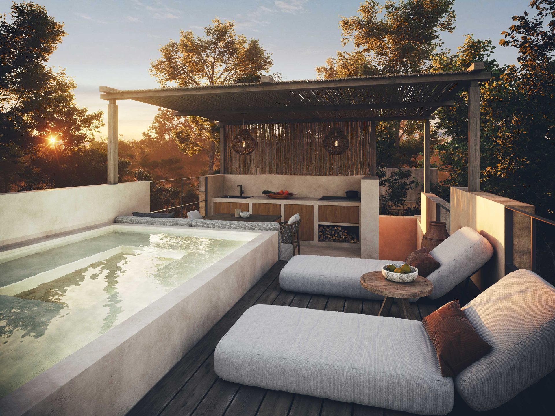 Tesoro Tulum is a tranquil retreat featuring three leisure villas thoughtfully designed to merge with Tulum’s natural landscape. The design emphasizes preserving the natural terrain by vertically organizing the villas across multiple levels, reducing the construction footprint and ensuring harmony with the surrounding environment.